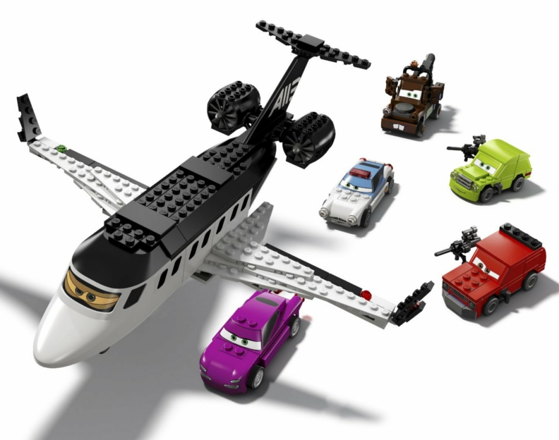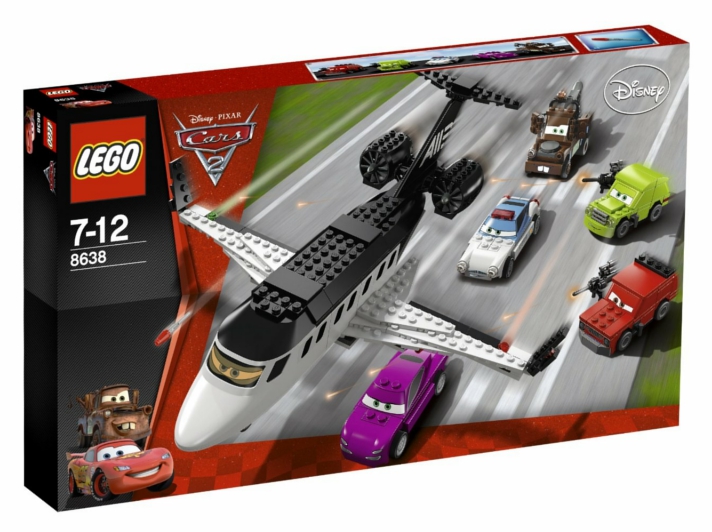 Ucieczka Szpiegowskim Odrzutowcem 8638 z serii Lego Cars. Agent Złomek, Finn McMissile i Holley Shiftweel próbują uciec szpiegowskim odrzutowcem. Czy okażą się szybsi na pasie startowym niż zły Profesor Z i jego cytrynowi kumple? W pudełku znajdują się klocki umożliwiające ułożenie samolotu oraz aż 5 wyżej wymienionych samochodów.