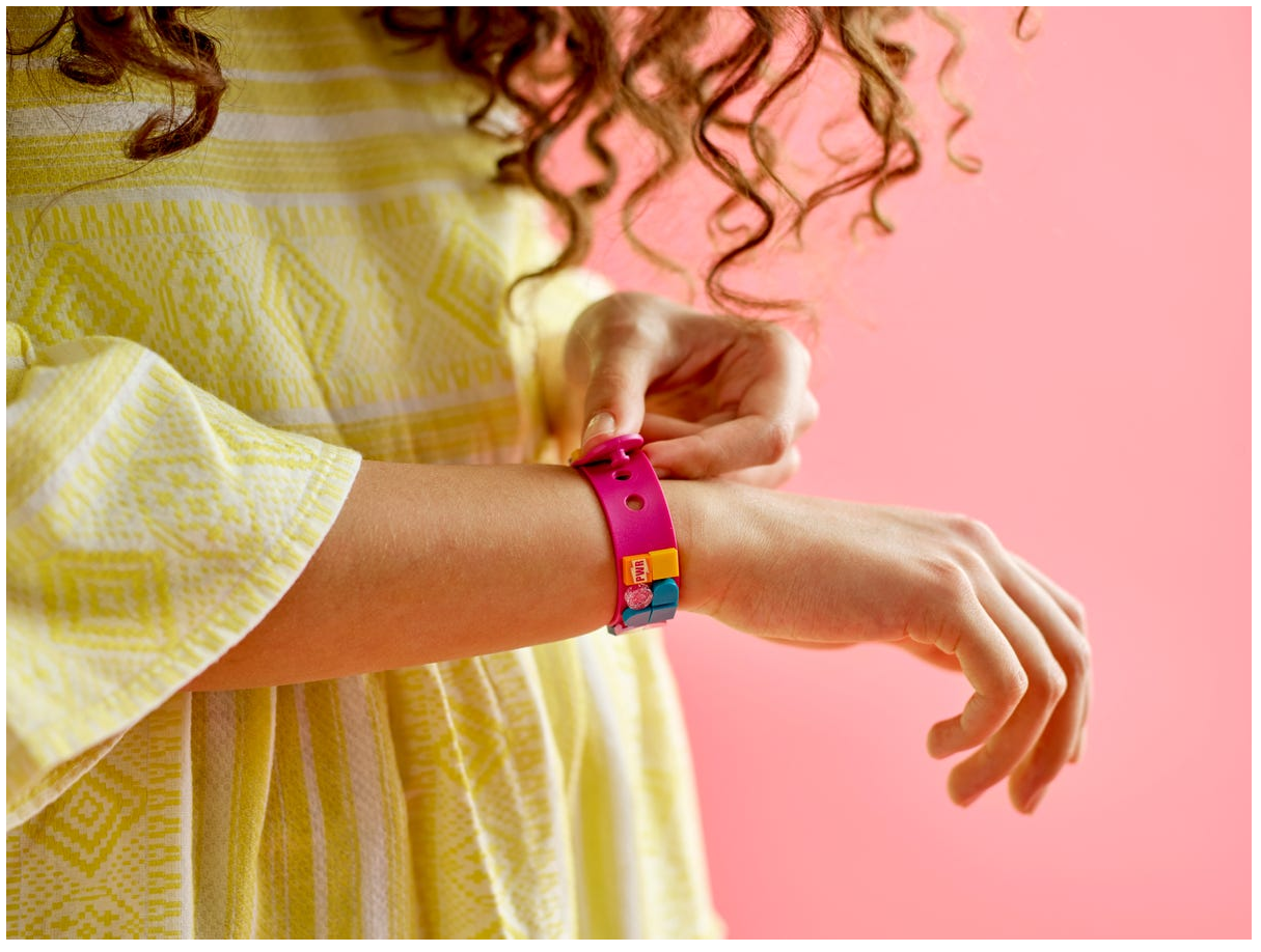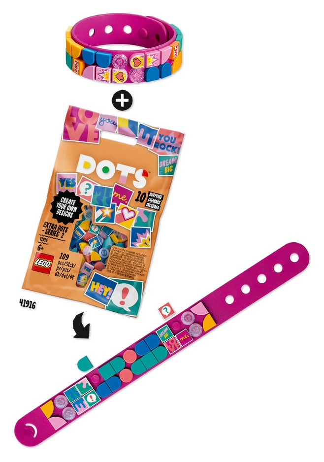 - Płytki z tego zestawu można wykorzystać do dekorowania innych modeli, więc szykuje się masa artystycznej zabawy! Bransoletki można również udekorować stylowymi płytkami z zestawu LEGO® DOTS Dodatki DOTS — seria 2 (41916), by dodać im charakteru.