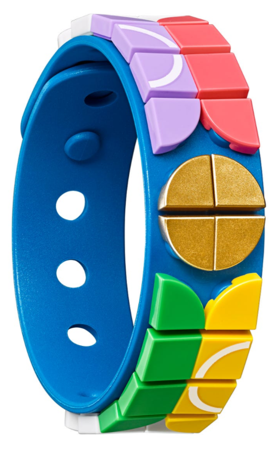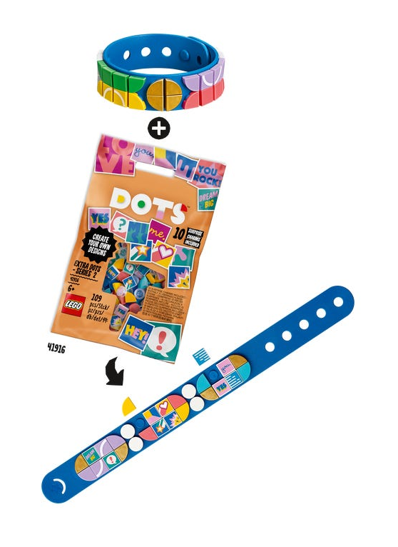 - Kolorowych płytek z zestawu można używać osobno lub z innymi elementami. Bransoletki można również udekorować stylowymi płytkami z zestawu LEGO® DOTS Dodatki DOTS — seria 2 (41916), a nabiorą jeszcze fajniejszego stylu!