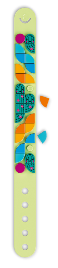 DOTS Bransoletka z kaktusem (41922). Kreatywna zabawka zawiera regulowaną, elastyczną opaskę w jasnozielonym kolorze, która pasuje na każdy nadgarstek, a do tego 32 kolorowe płytki — w tym specjalne płytki z nadrukiem kaktusa. Ozdobienie bransoletek jest łatwe i intuicyjne, więc dzieci mogą dopasować je do własnego stroju lub humoru.
