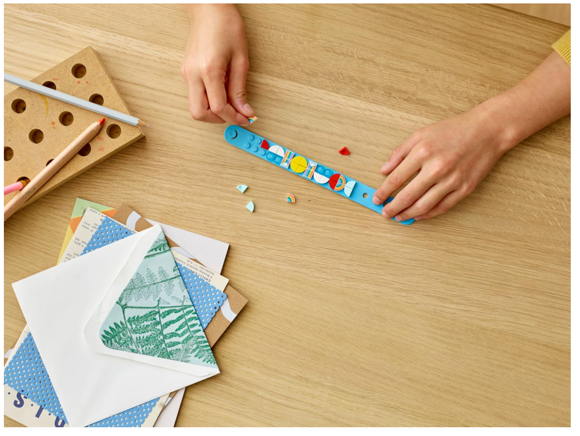 - Kolorowe płytki sprawdząsię nie tylko w tym zestawie, ale też w innych pracach ręcznych. Bransoletki można też upiększyć klockami z zestawu LEGO® DOTS™ 41908 Dodatki DOTS — seria 1.