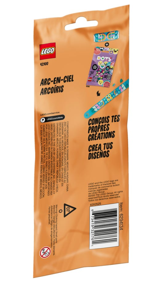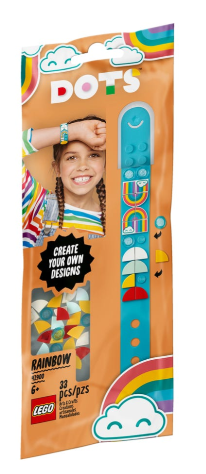 - Zachęć dzieci do kreatywnych prac ręcznych uroczym zestawem LEGO® DOTS™ Bransoletka z tęczą (41900), który zawiera regulowaną bransoletkę i 32 kolorowe płytki. Zabawa zaczyna się od dekorowania — wystarczy wysypać klocki!