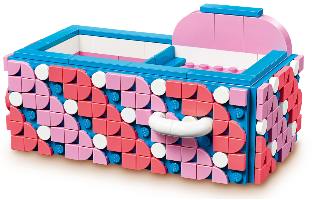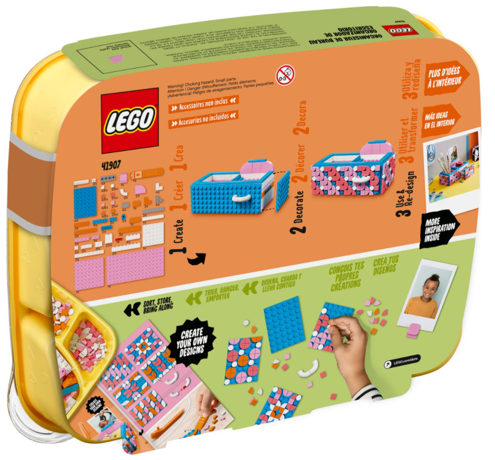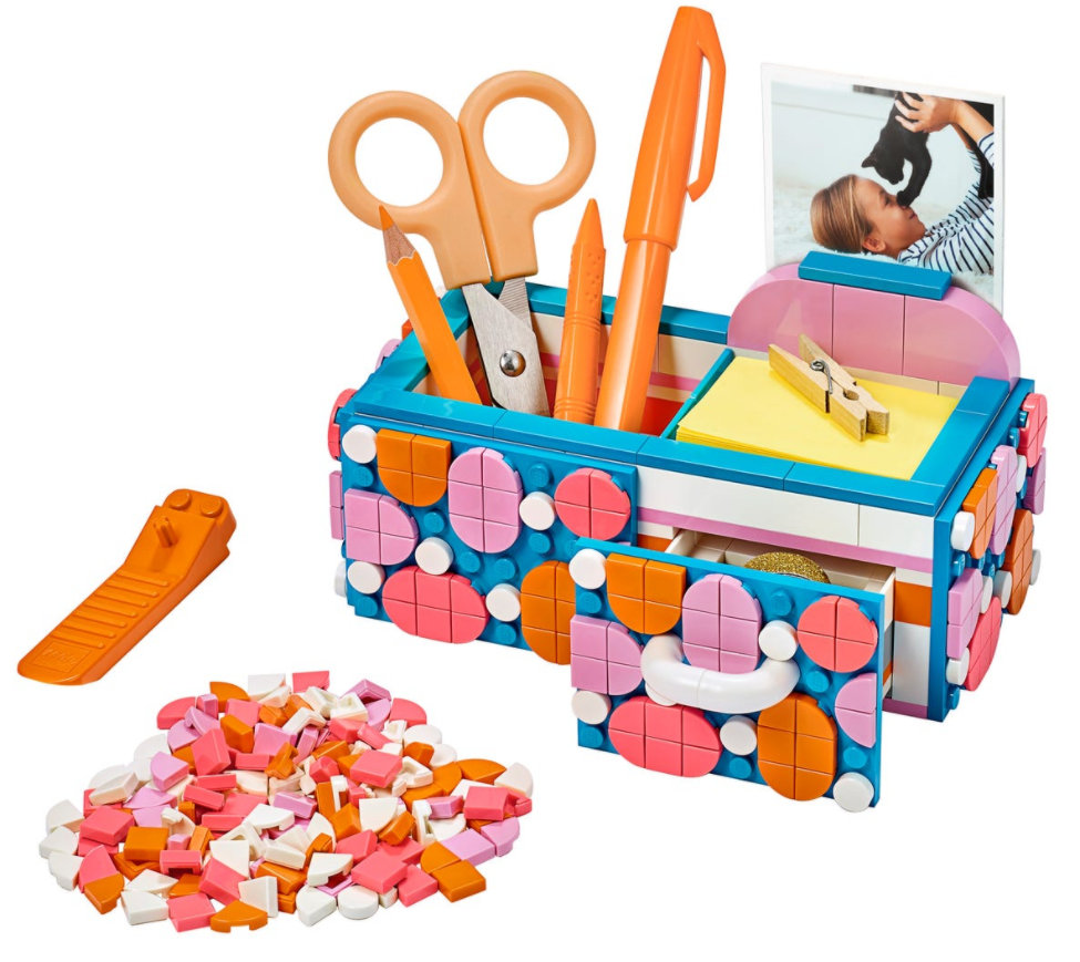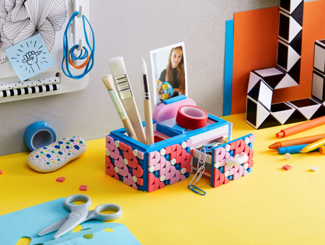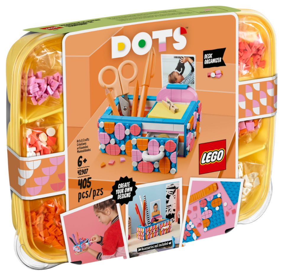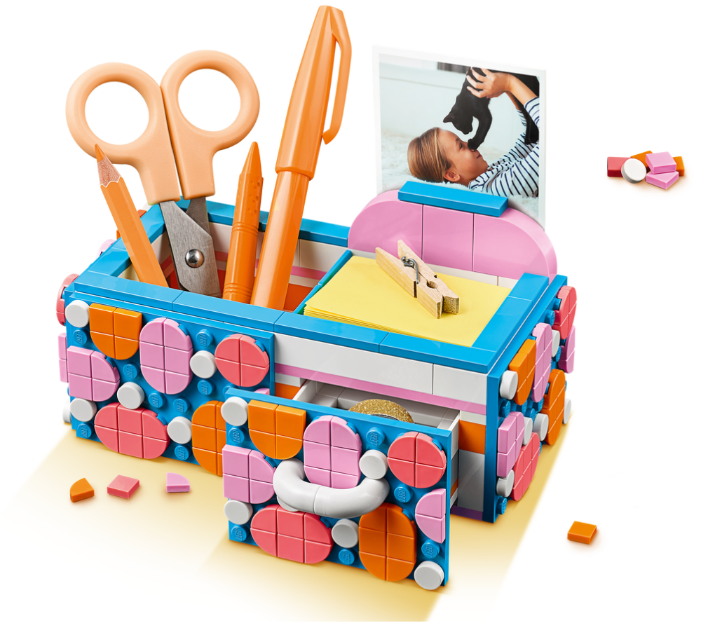 - Podaruj dziecku zestaw LEGO® DOTS (41907) z organizerem na biurko, by zachęcić je do ćwiczenia wyobraźni. W zestawie jest wielokolorowa, dwuczęściowa skrzyneczka, uchwyt na zdjęcie oraz otwierana szufladka. Zabawa zaczyna się od składania klocków — wystarczy wysypać je z pojemnika!