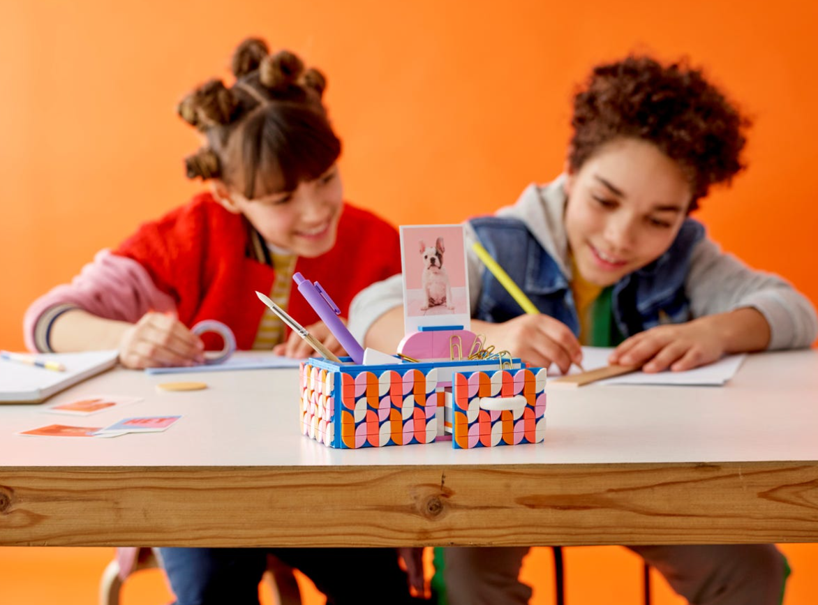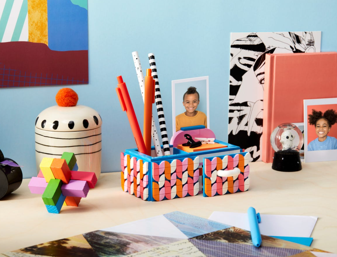 W zestawie jest dwuczęściowy, wielokolorowy organizer na ołówki, spinacze i inne przybory. Jest tam także szufladka z białym uchwytem na cenne drobiazgi oraz ramka na zdjęcie, a do tego kolorowe płytki do dekorowania, by dzieci mogły pogimnastykować wyobraźnię i wyrazić siebie, dostosowując organizer do swojego gustu.