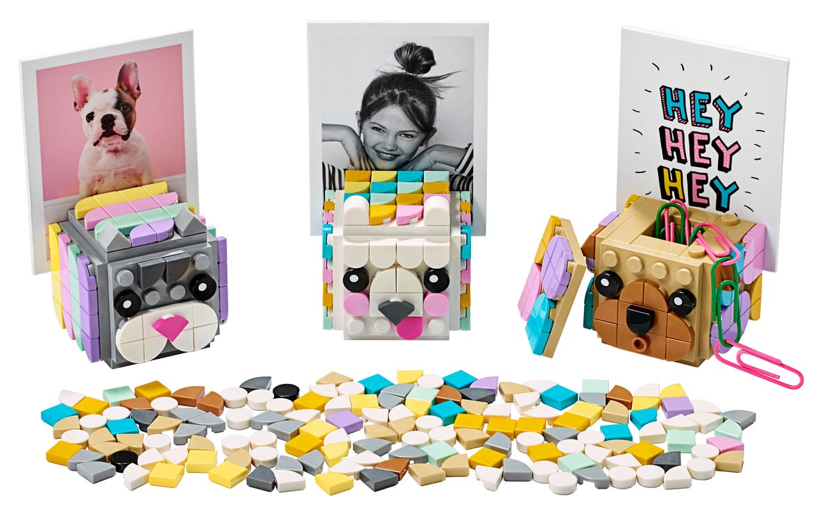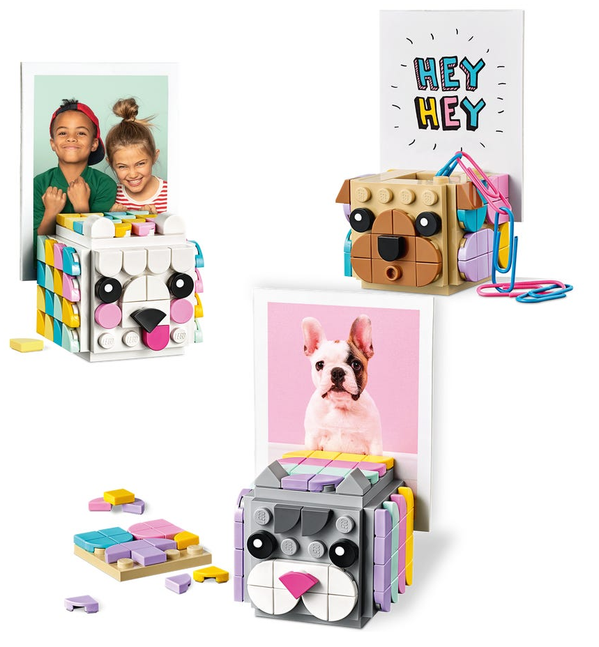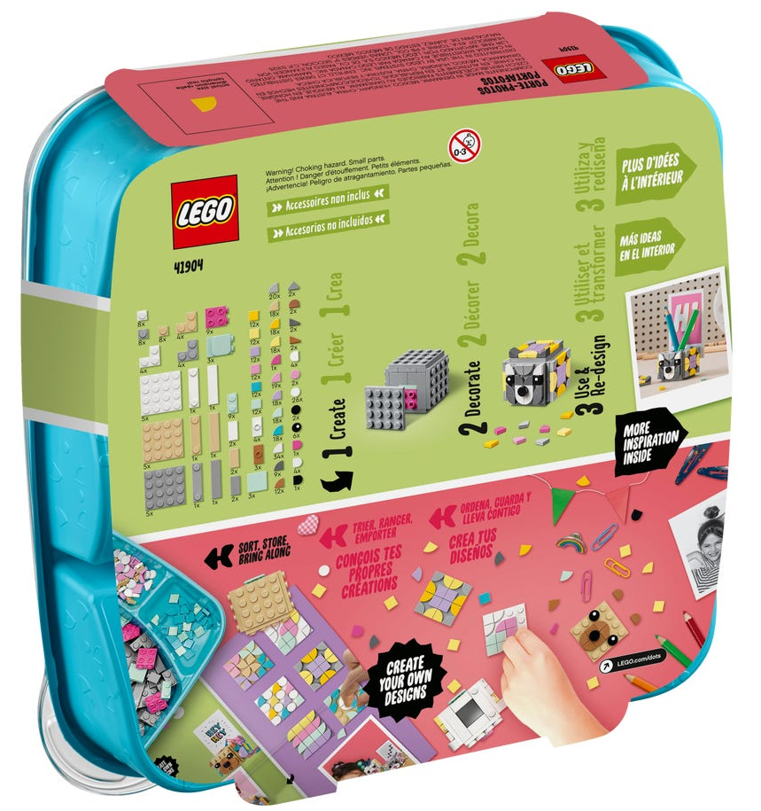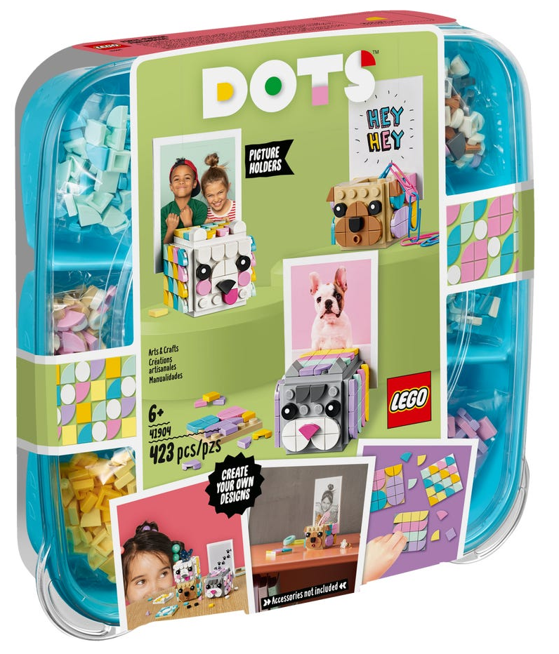 - Zachwyć młodego miłośnika prac ręcznych uroczym zestawem trzech kostek LEGO® DOTS (41904) z pyszczkami zwierząt, pokrywkami i podstawkami na zdjęcia. Zabawa zaczyna się od złożenia stojaków na zdjęcia — wystarczy otworzyć pudełko!
