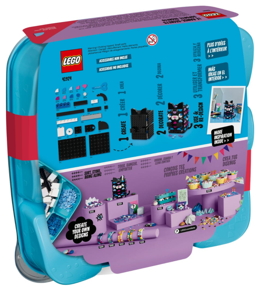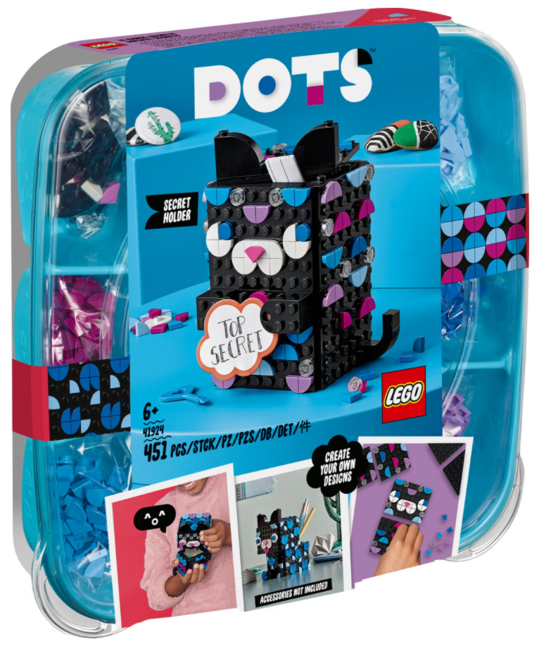 - Zestawy LEGO® DOTS pozwalają dzieciom tworzyć ciekawe dzieła. Budowa świetnego schowka w kształcie kota podsunie im wiele pomysłów i pomoże zyskać większą pewność siebie.