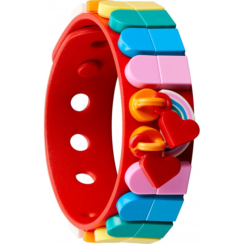 Dzięki zestawowi LEGO® DOTS Tęczowa bransoletka z zawieszkami (41953) miłośnicy rękodzieła mogą wyrazić siebie za pomocą wszystkich kolorów tęczy. Ten zestaw dla dzieci w wieku od sześciu lat zawiera czerwoną regulowaną bransoletkę, dwa zaczepy do zawieszek i dwie wiszące zawieszki w kształcie serca, a także mnóstwo tęczowych płytek. Dzieci mogą ozdobić bransoletkę tak, aby pasowała do ich ubrań lub nastroju.