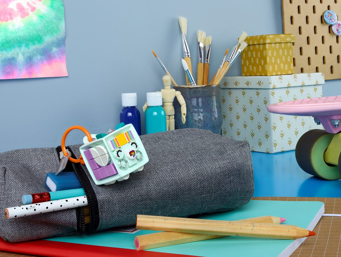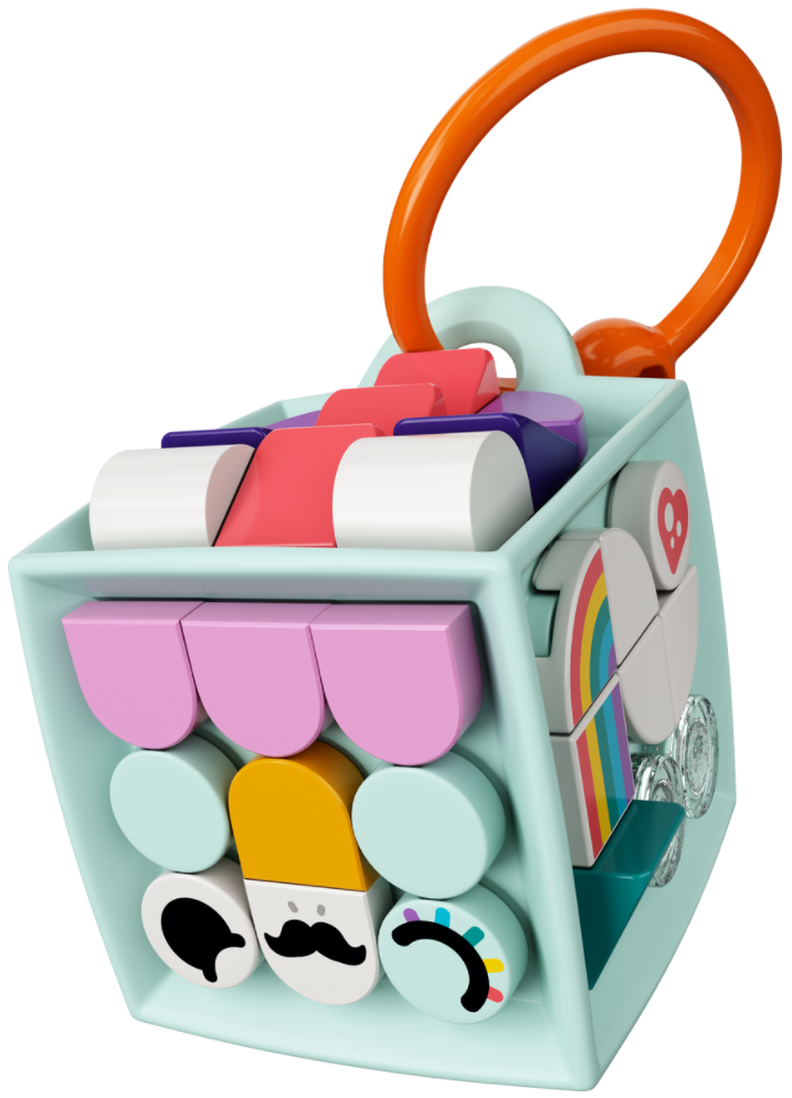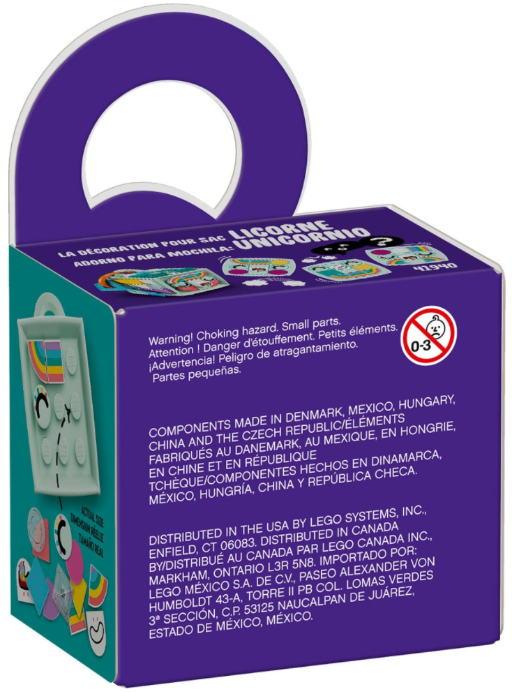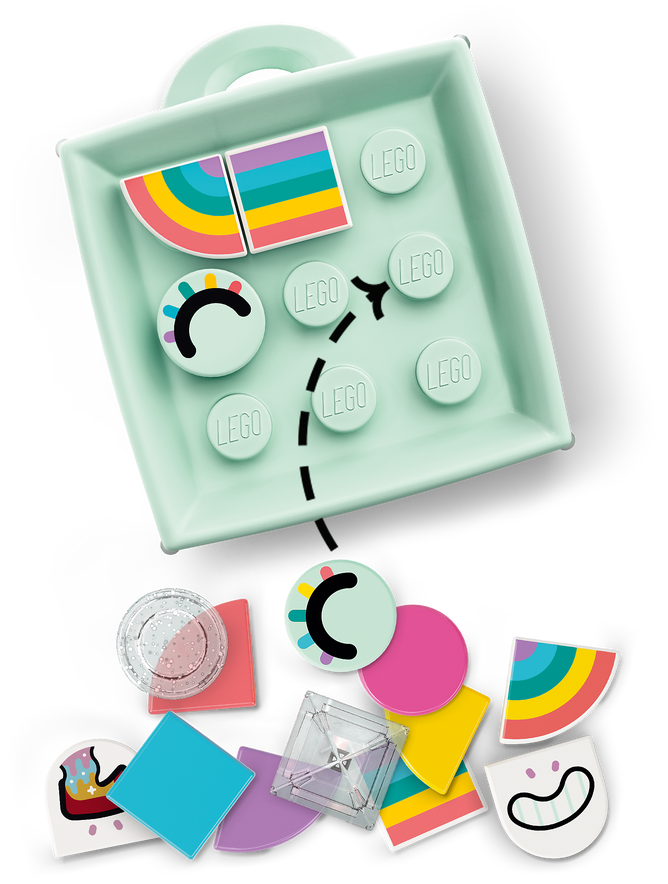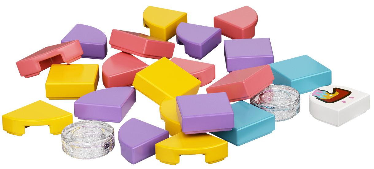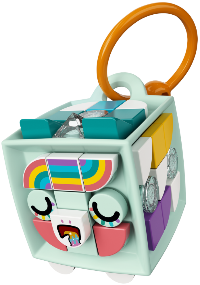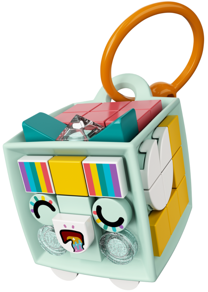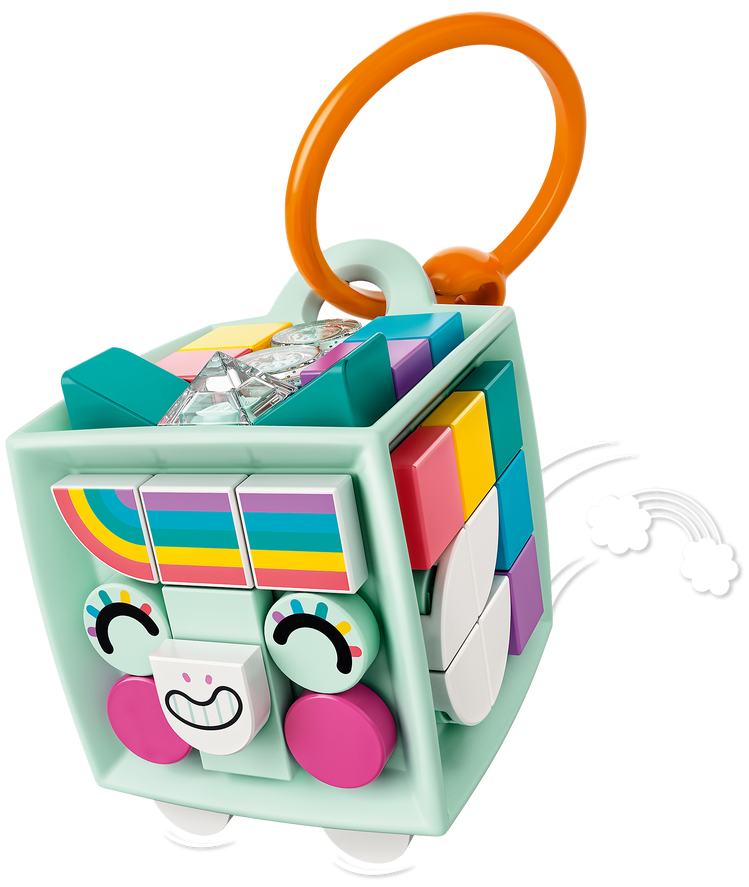 Ten praktyczny zestaw do rękodzieła zawiera kostkę, którą można ozdabiać płytkami na różne sposoby, kółko do zawieszenia jej oraz separator płytek. W komplecie są tęczowe i brokatowe płytki do zaprojektowania magicznego jednorożca, a woreczek Dodatki DOTS — seria 4 (41931, sprzedawany osobno) z dodatkowymi płytkami pozwoli projektować jeszcze więcej kreatywnych buziek i wzorów.