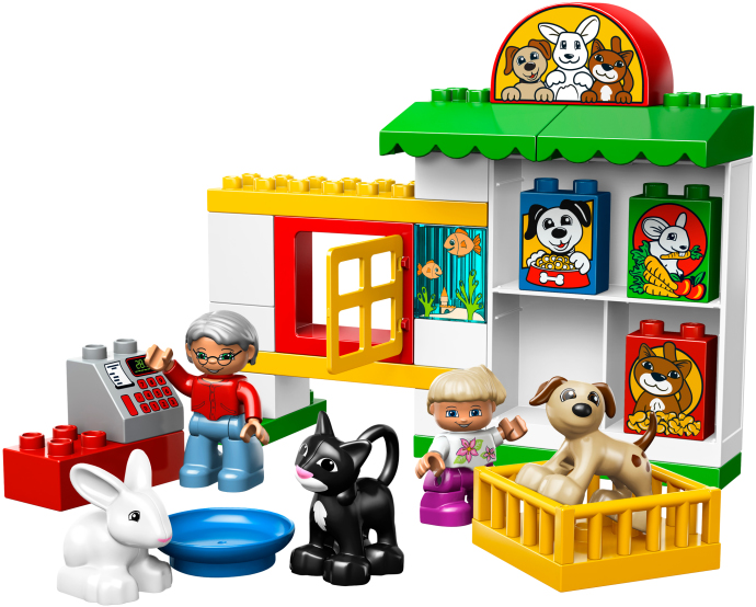W sklepie ze zwierzętami w Lego Ville jest mnóstwo małych, słodkich zwierzątek i jedzenia dla nich! Mała dziewczynka uwielbia rozmawiać z psem, kotem i króliczkiem. Pomaga je karmić, a potem wkłada z powrotem do klatek. Przyjazny sprzedawca jest ciągle zajęty obsługą kasy lub układaniem towaru na półkach.