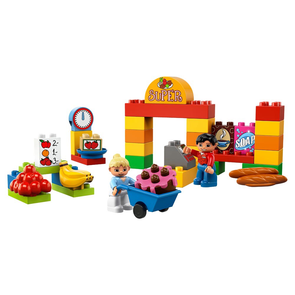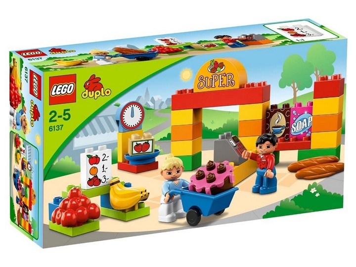 Lego Duplo 6137 Mój pierwszy Supermarket z serii Ville. Zabawa w sklep to jeden z ulubionych tematów dziecięcych zabaw. Zestaw zawiera aż 2 ludziki oraz szereg atrakcyjnych artykułów spożywczych. Dzieci szybko uczą sie rozpoznawać przedmioty poprzez zabawę kolorowymi klockami. W Supermarkecie znajdziemy wagę oraz poręczny wózek na towary. Wielkość klocków dopasowana jest do małych raczek dzieci.