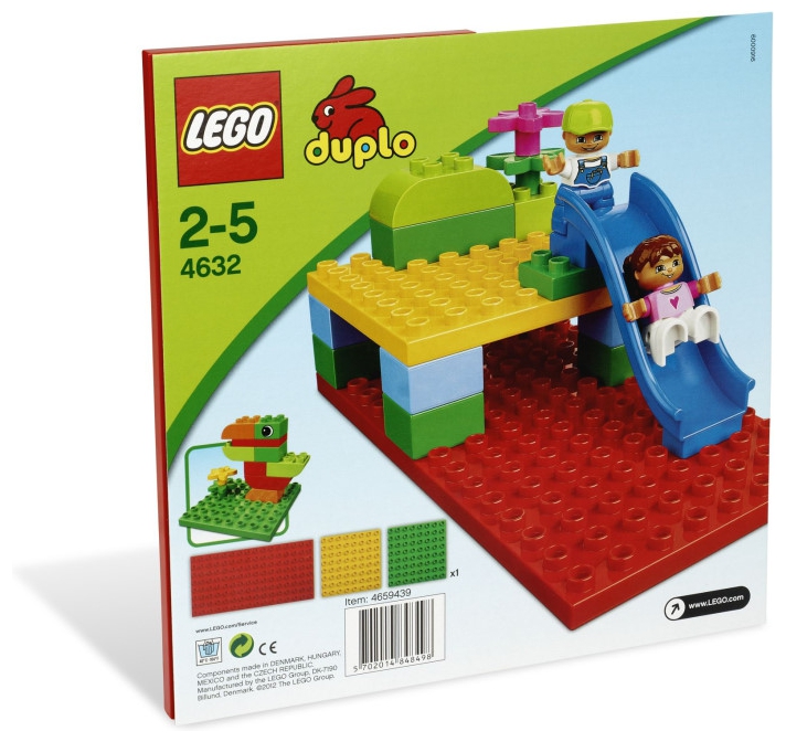 Płytki konstrukcyjne 4632 z serii Lego Duplo to nieodzowny element dla początkujących budowniczych. W pudełku znajduję się duża czerwona i 2 mniejsze (zielona i żółta). To doskonałya podstawa każdej budowli. Płytki konstrukcyjne umożliwiają dziecku łatwiejsze budowanie, a rodzicom ograniczenie miejsca zabawy.