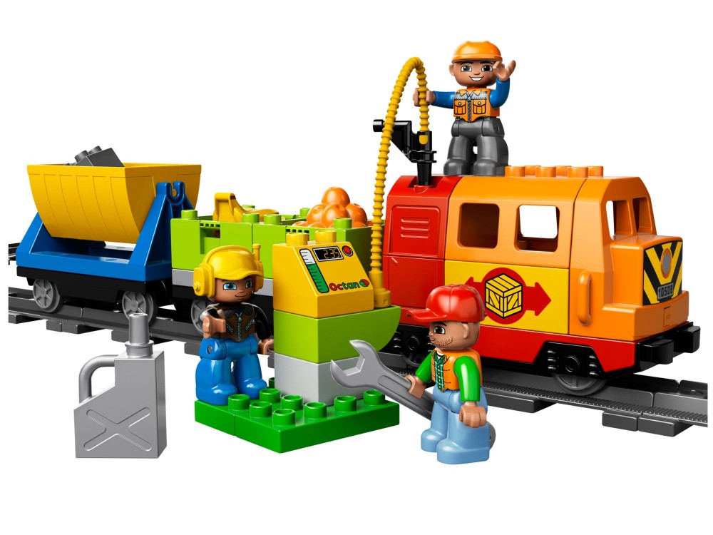 Wskocz na pokład lokomotywy wydającej realistyczne efekty dźwiękowe i wypełnij wagony skałami z kamieniołomu. Potem rozładuj je dźwigiem i nie zapomnij zatankować lokomotywy przed następnym kursem! Zestaw zawiera ponad 160 cm torów, most z tunelem, ciężarówkę, kamieniołom, budynek z działającym dźwigiem, mnóstwo kolorowych elementów DUPLO i 3 figurki DUPLO.
