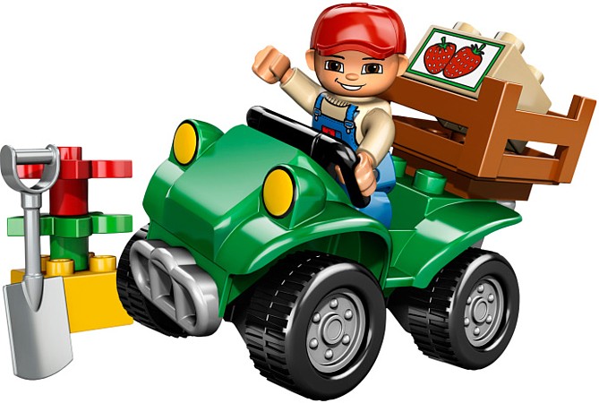 Quad farmera od Lego Duplo. Na farmie Lego zawsze jest coś do zrobienia, a quad pomoże Ci w tych codziennych obowiązkach. Użyj tego wspaniałego pojazdu do poruszania się po farmie szybciej i łatwiej, tym bardziej, że właśnie rozpoczął się sezon zbioru truskawek. Farmer ma pełną skrzynkę truskawek do zabrania - zatem czas na przejażdżkę quadem!