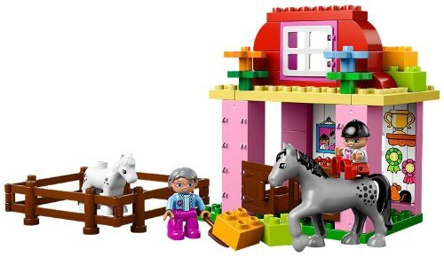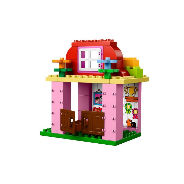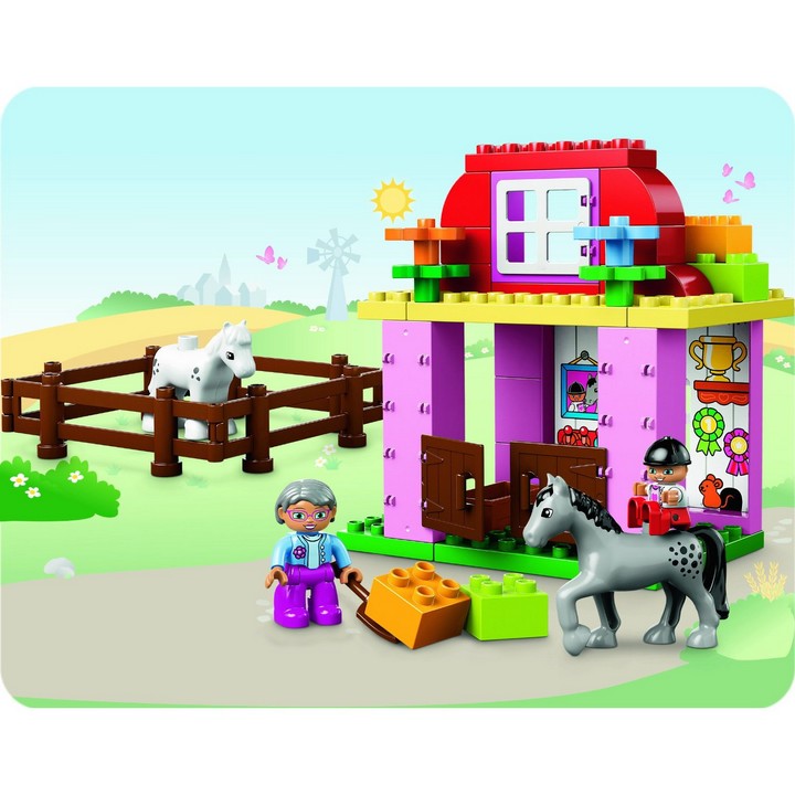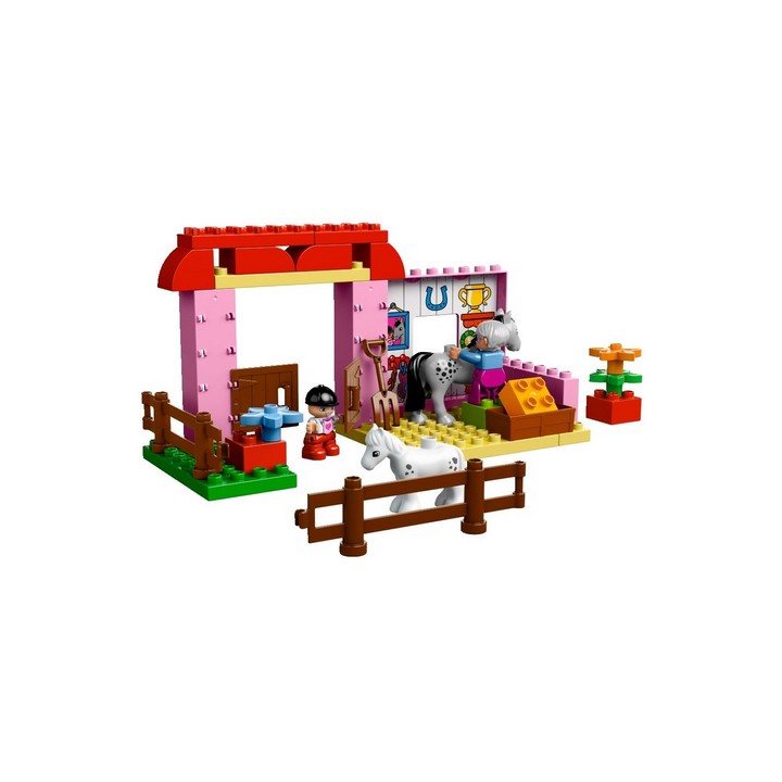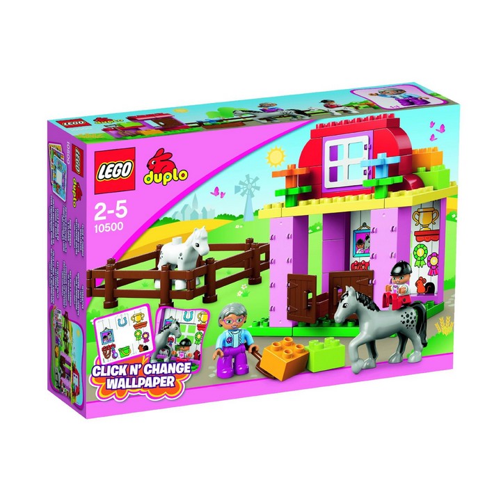 Stadnina 10500 z pewnością przyda się do profesjonalnego przygotowania koni do zawodów! Podczas gdy babcia karmi konie, podsuwając im klocki specjalne klocki przedstawiające bale siana, wnuczka troskliwie zajmuje się źrebięciem. Weź się do pracy, używając wideł i zdejmowanej tapety, lub postaw płotek, aby zapewnić bezpieczeństwo zwierzętom. To piękny dzień — w sam raz, by budować na farmie Duplo. Dodatkowo w połączeniu z domkiem do zabawy Lego Duplo (zestaw 10505) można stworzyć jeszcze więcej kreatywnej zabawy!