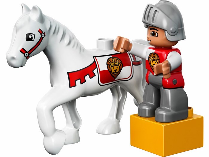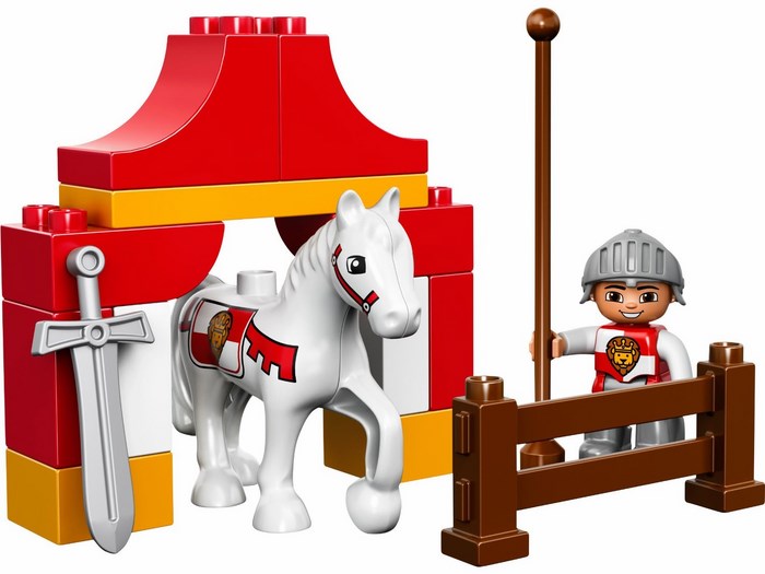 Baw się dzielnym konnym rycerzem z zestawu Turniej rycerski LEGO® DUPLO®, w którym znajdziesz też lancę, miecz, średniowieczny namiot turniejowy oraz płotek. Zaszarżuj po zwycięstwo w średniowiecznym turnieju! Pomóż koniowi w skokach przez płotek. Opowiedz dziecku o średniowiecznych turniejach przy okazji zabawy tym kolorowym i interesującym zestawem. Bawiąc się tym prostym modelem, dziecko może opanować podstawowe umiejętności składania klocków. Produkty LEGO® DUPLO® zostały zaprojektowane tak, by były interesujące i bezpieczne dla małych rączek