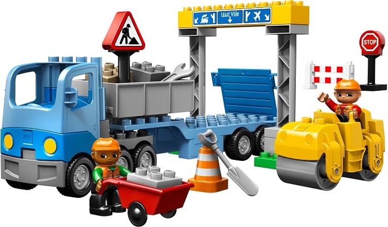 Budowana jest nowa autostrada i kierowca ciężarówki ma zapakowane wszystko, czego trzeba do pracy. Pracownik budowy jest zajęty wyrównywaniem nowego chodnika walcem, a inny ładuje klocki na taczkę.