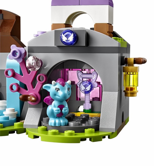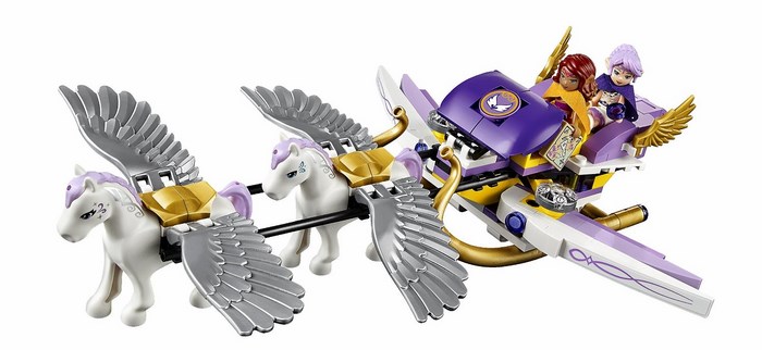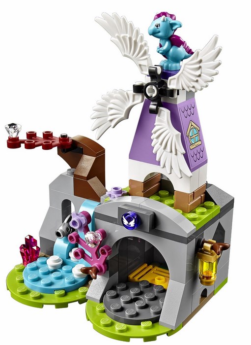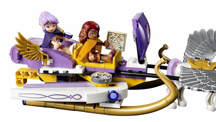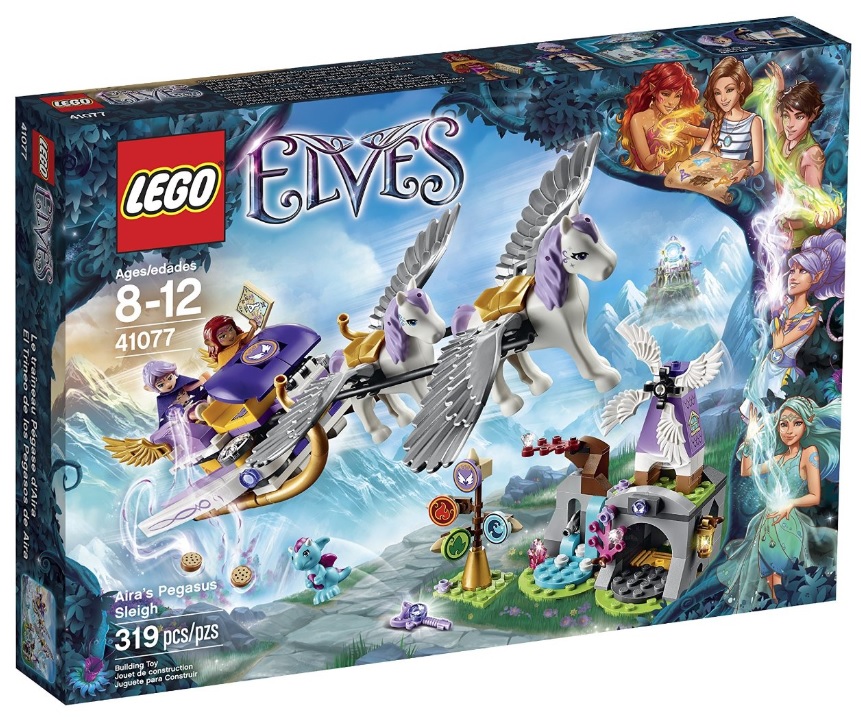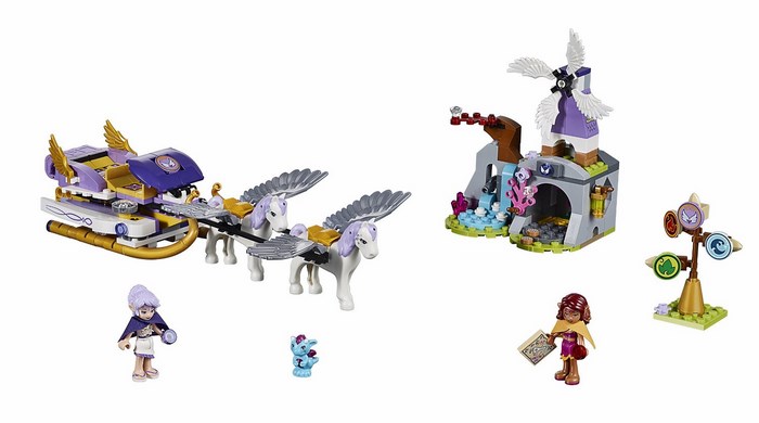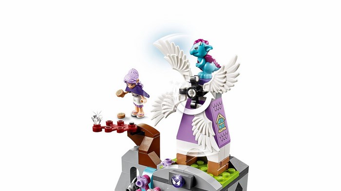 Zbuduj latające sanie dla elfki wiatru, Airy Whisperwind. Wznieś się wysoko w niebo na saniach ciągniętych przez 2 pegazy, Promyczka i Rufusa, aby pomóc elfom LEGO® znaleźć magiczny klucz wiatru, dzięki któremu będą mogły odesłać swoją zaginioną przyjaciółkę, Emily Jones, z powrotem do świata ludzi. Przygotuj na drogę skrzynię z ciasteczkami, a potem razem z Airą i elfką ognia o imieniu Azari Firedancer podążaj za magiczną mapą, aby znaleźć na niebie starożytny wiatrak. Wiadomo, że smocze dziecko, Miku, ma ostatni klucz, ale czy elfom uda się go odzyskać? Pomóż Airze wykorzystać magiczny podmuch wiatru, by rzucić w stronę Miku ciasteczka i w ten sposób odciągnąć uwagę młodej smoczycy od pilnowanego przez nią klucza.