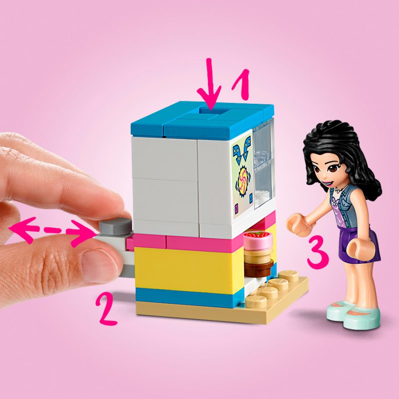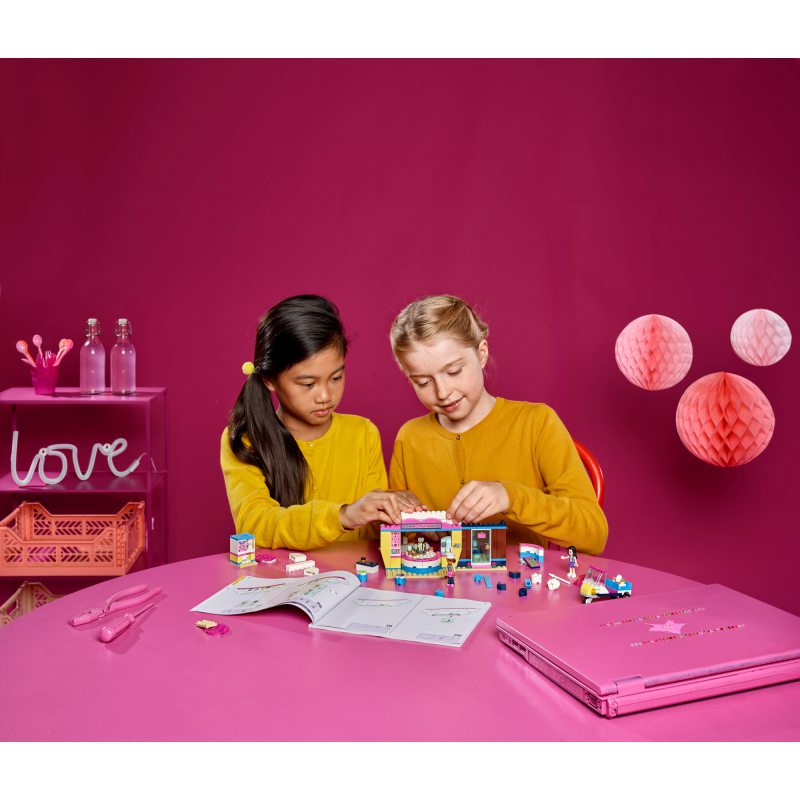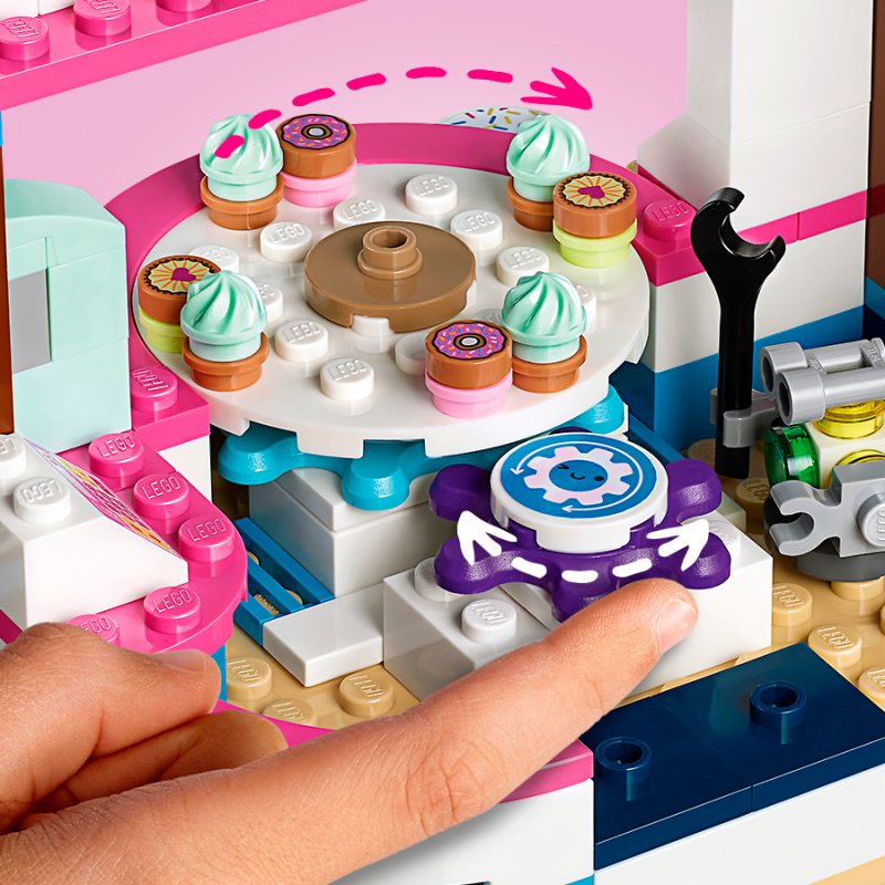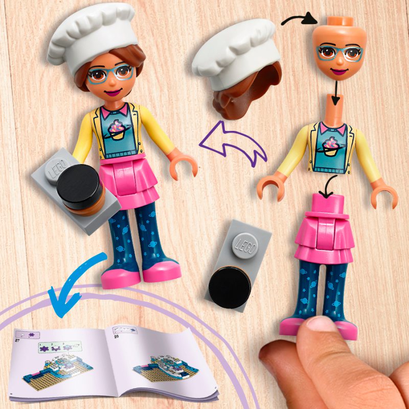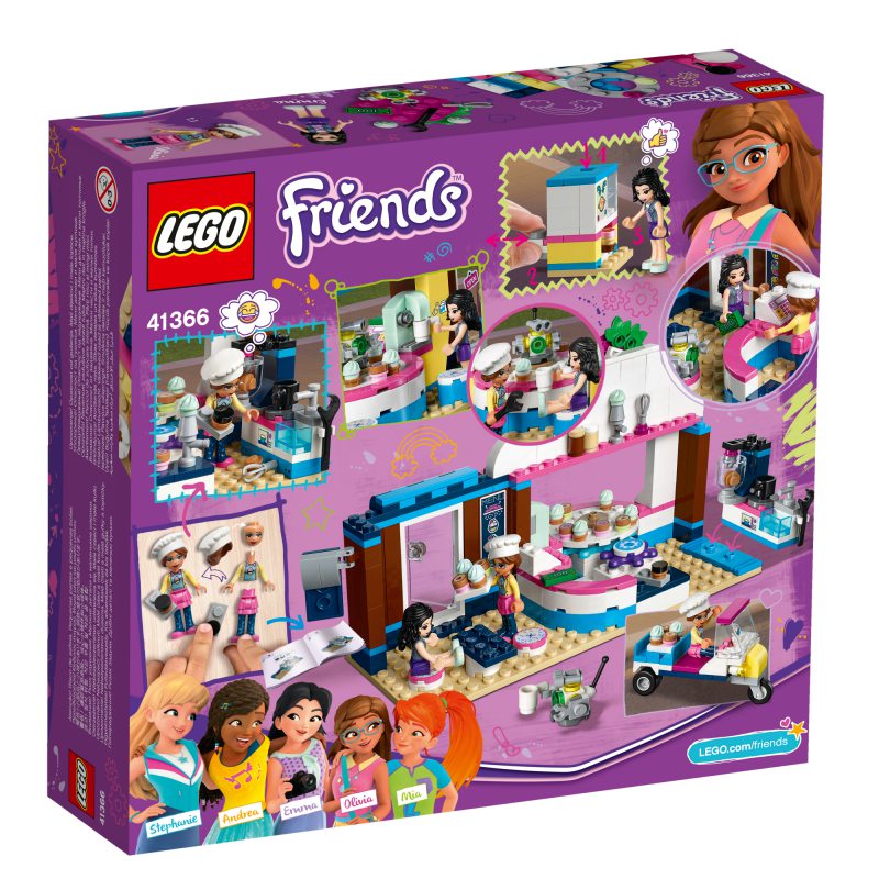 Zasmakuj połączenia technologii i gastronomii w zestawie LEGO® Friends 41366 Cukiernia z babeczkami Olivii. Znajdziesz tu mnóstwo niezwykłych gadżetów do pomysłowej zabawy: w cukierni znajduje się taca obracająca się na kołach zębatych, zainspirowana wyposażeniem restauracji z sushi w technologicznej dzielnicy Miasta Heartlake. Ma też niezwykłą maszynę do wydawania babeczek, miejsce do jedzenia w środku i na zewnątrz oraz kuchnię z piecem, zlewem i przyborami do pieczenia ciasta. Kolejną dawkę twórczej zabawy zapewnia mały skuter do rozwożenia zabawkowych babeczek po całym Mieście Heartlake. W zestawie dwie minilaleczki: Olivia i Emma oraz figurka robota.