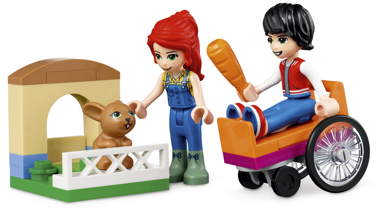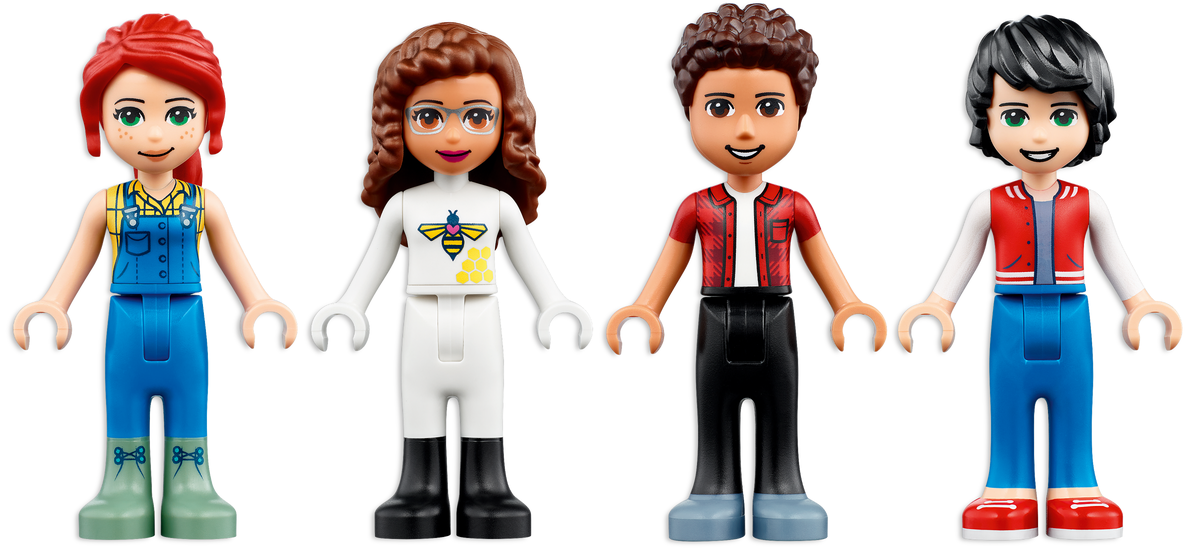 - Mnóstwo elementów — W zestawie jest pięć postaci LEGO® Friends, w tym minilaleczki Mii i Rivera z wymiennymi twarzami, a także figurka króliczka, rower transportowy, ul oraz imadło stolarskie