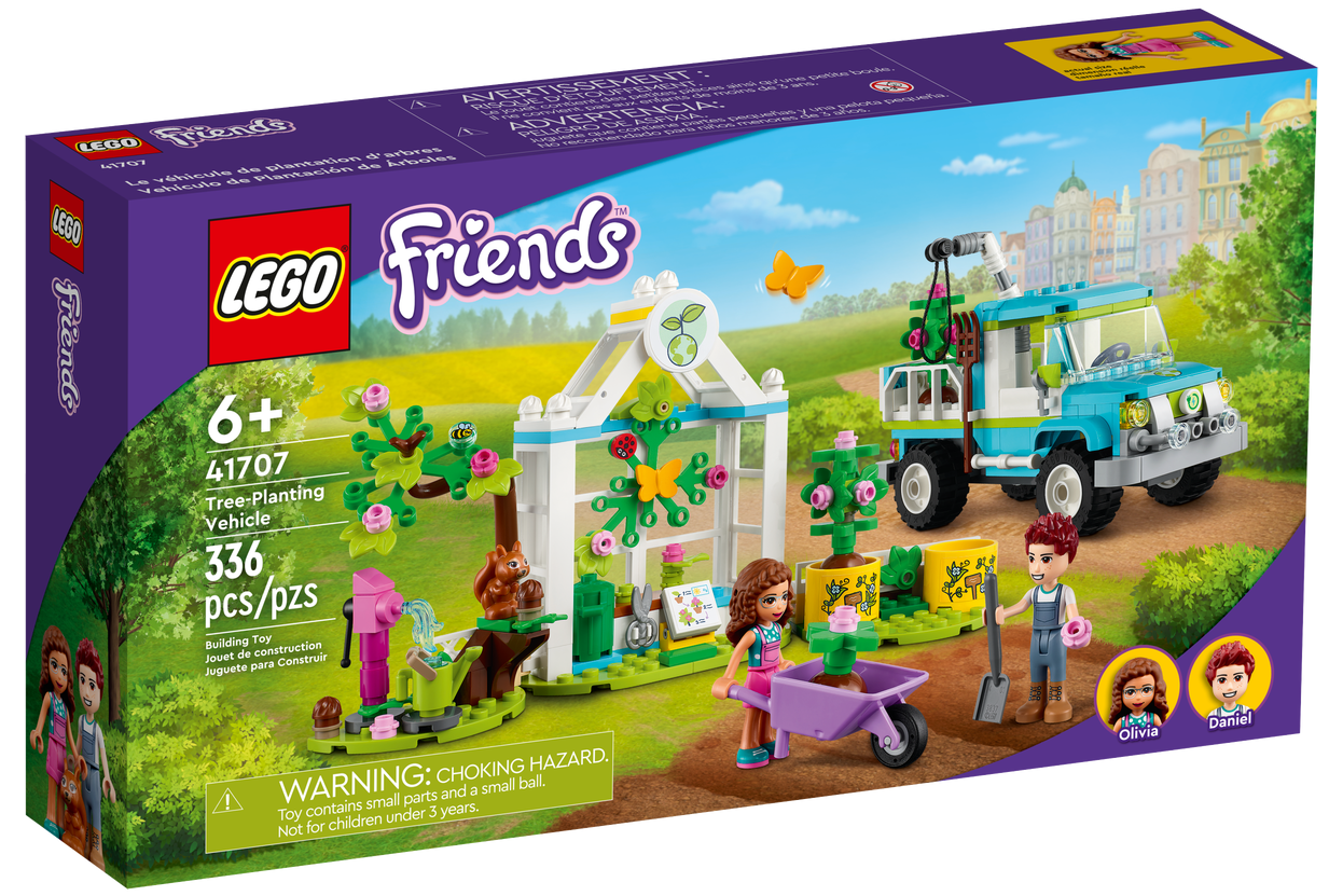 - Zachwyć małych ogrodników — miłośnicy ochrony środowiska docenią zestaw LEGO® Friends Furgonetka do sadzenia drzew (41707) z ekologiczną furgonetką i szkółką drzew