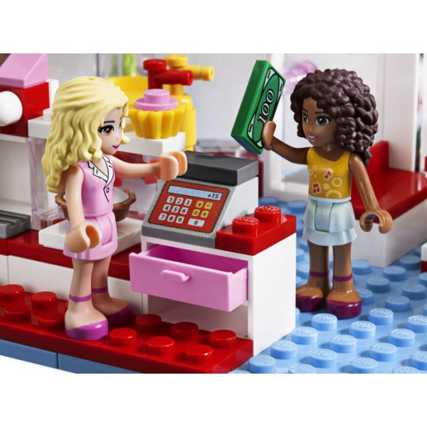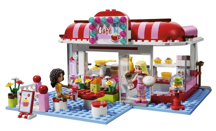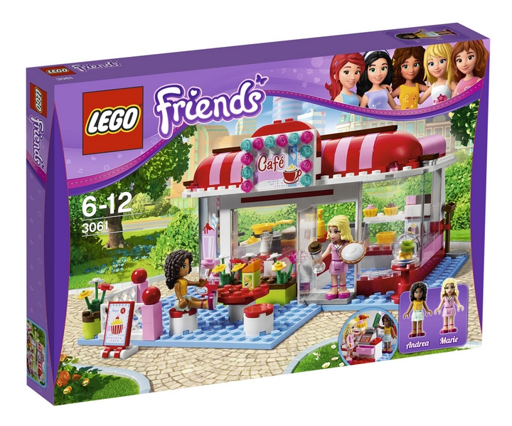 Lego Friends Kawiarnia 3061 - Zbuduj dla przyjaciółek przytulną kawiarnię z serii Lego Friends! Andrea wybrała się na spacer po miejskim parku. Na pewno wstąpi na ciastko do swojej ulubionej kawiarni. Przemiła kelnerka Marie już z daleka dostrzega swoją koleżankę i szykuję dla niej duży kawałek!