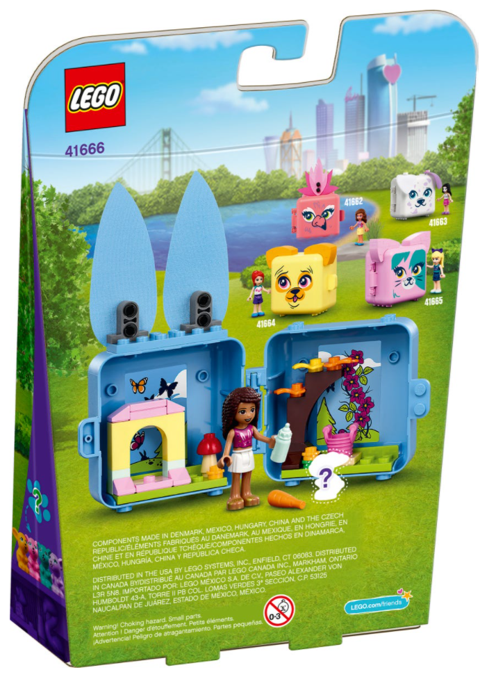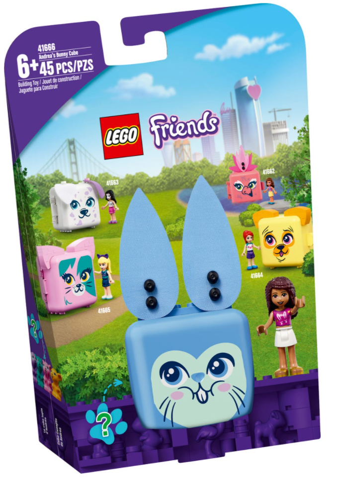 - Kostki ze zwierzętami LEGO® Friends to idealny prezent dla dzieci, które lubią kreatywność w zabawie. Przenośna kostka Andrei z królikiem (41666) zachęca do zabawy w opiekę nad zwierzątkiem i świetnie prezentuje się na półce.