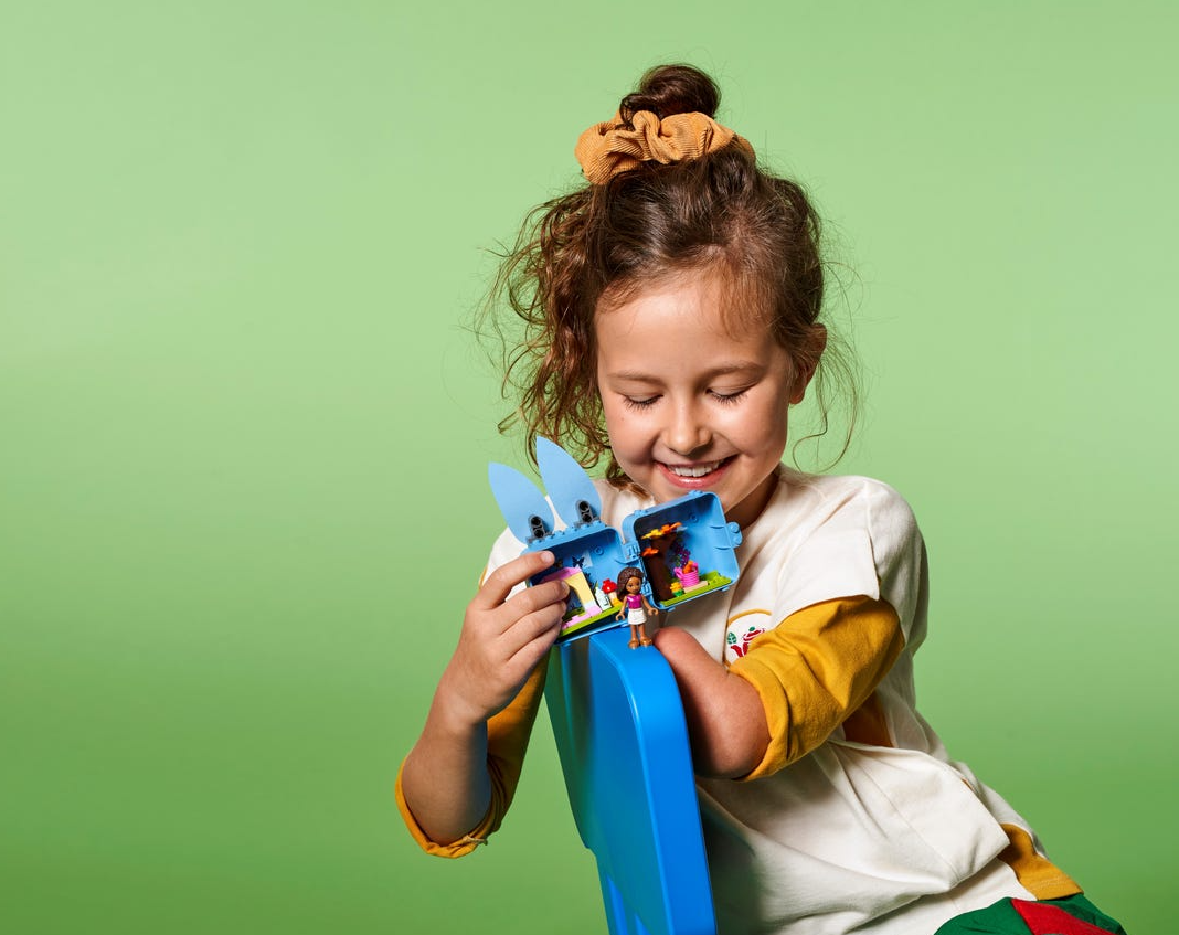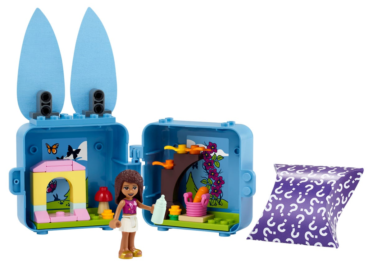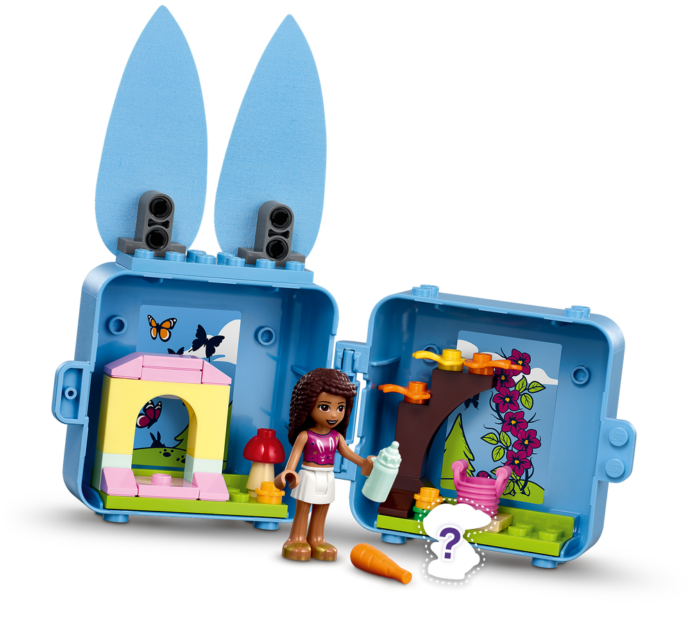 - Kostka zawiera minilaleczkę LEGO® Friends Andreę, figurkę królika w jednym z czterech dostępnych kolorów, klatkę do zbudowania, grzyb i drzewo, a także cały koszyk inspirujących akcesoriów.