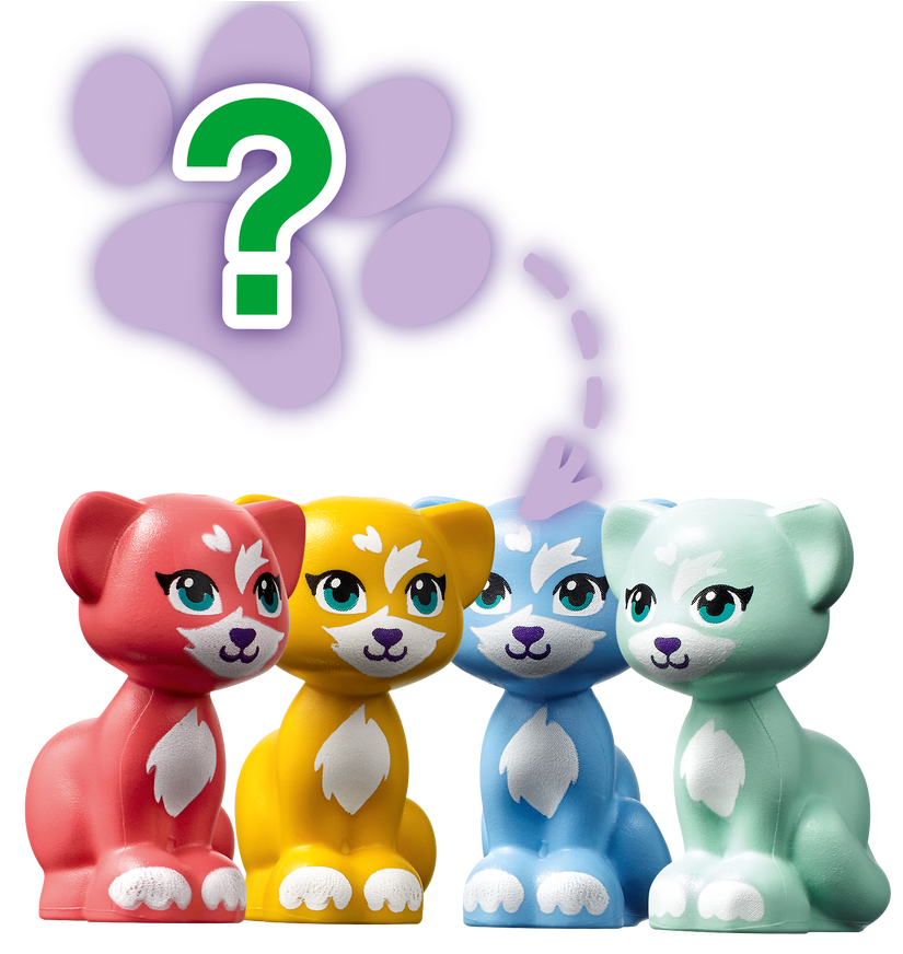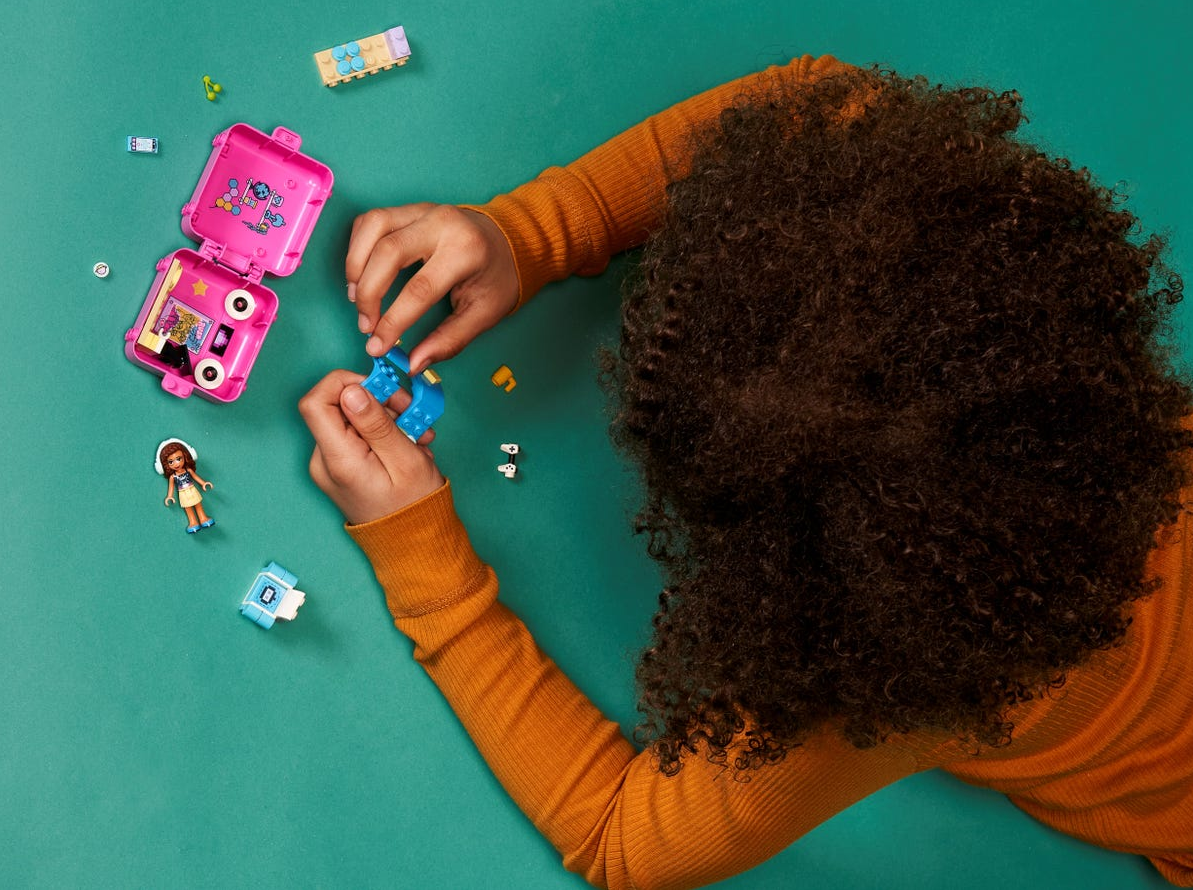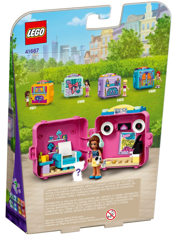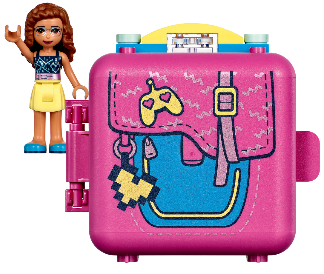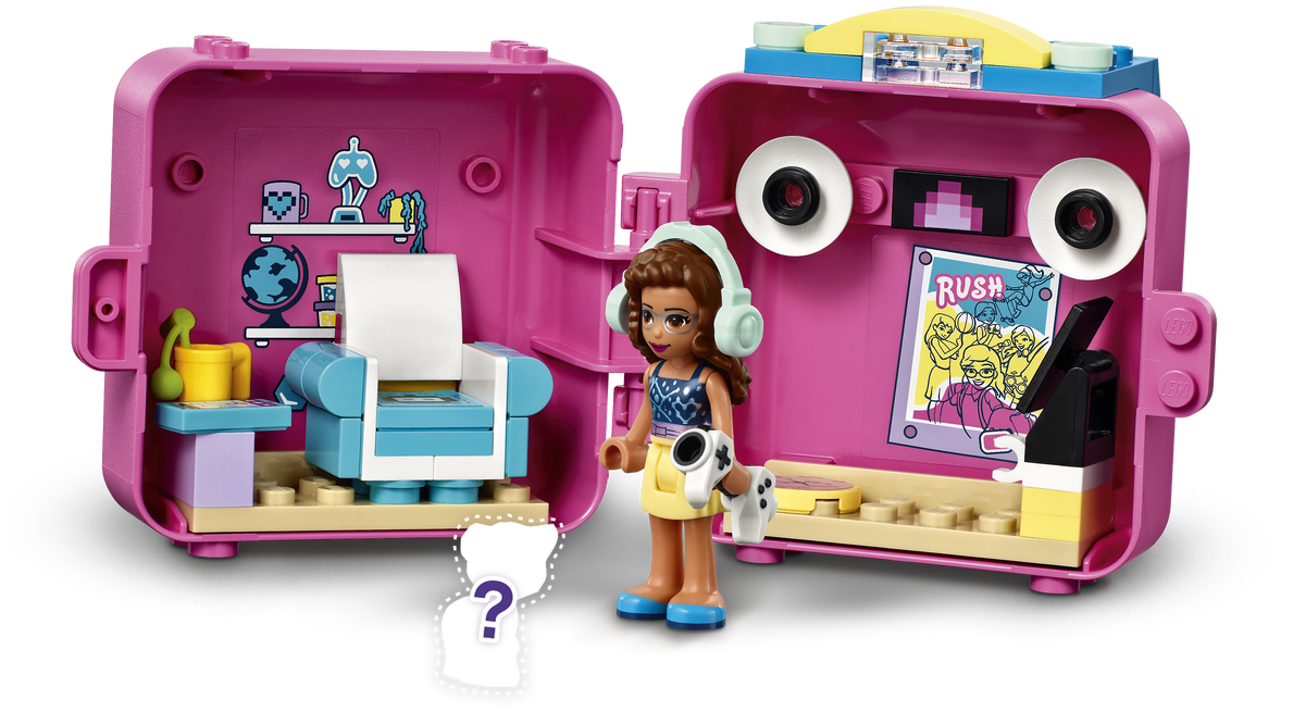 - Zamknięty w kostce zestaw jest pełen kreatywnych elementów — znajdziesz w nim minilaleczkę LEGO® Friends Olivię, zabawkowego kota w jednym z czterech możliwych kolorów, wygodny fotel, głośniki, słuchawki, telewizor i kubek.