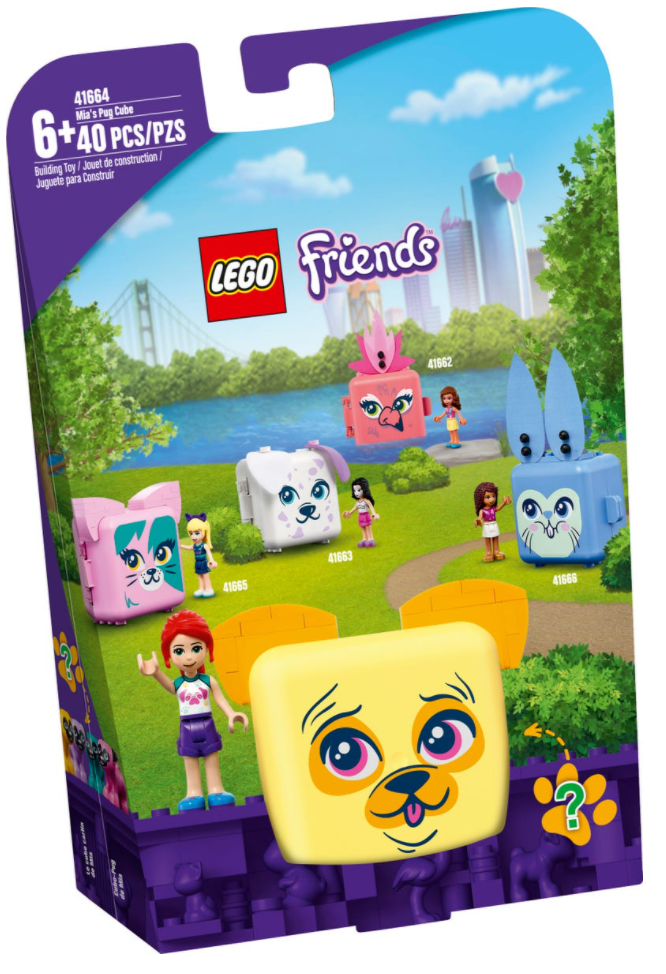 - Zestaw LEGO® Friends Kostka Mii z mopsem (41664) zachęca do opieki nad zwierzętami. Urocza skrzyneczka ozdobiona psim motywem pozwala zaopiekować się zabawkowym szczeniakiem, a do tego jest tak mała, że można się nią bawić w podróży.