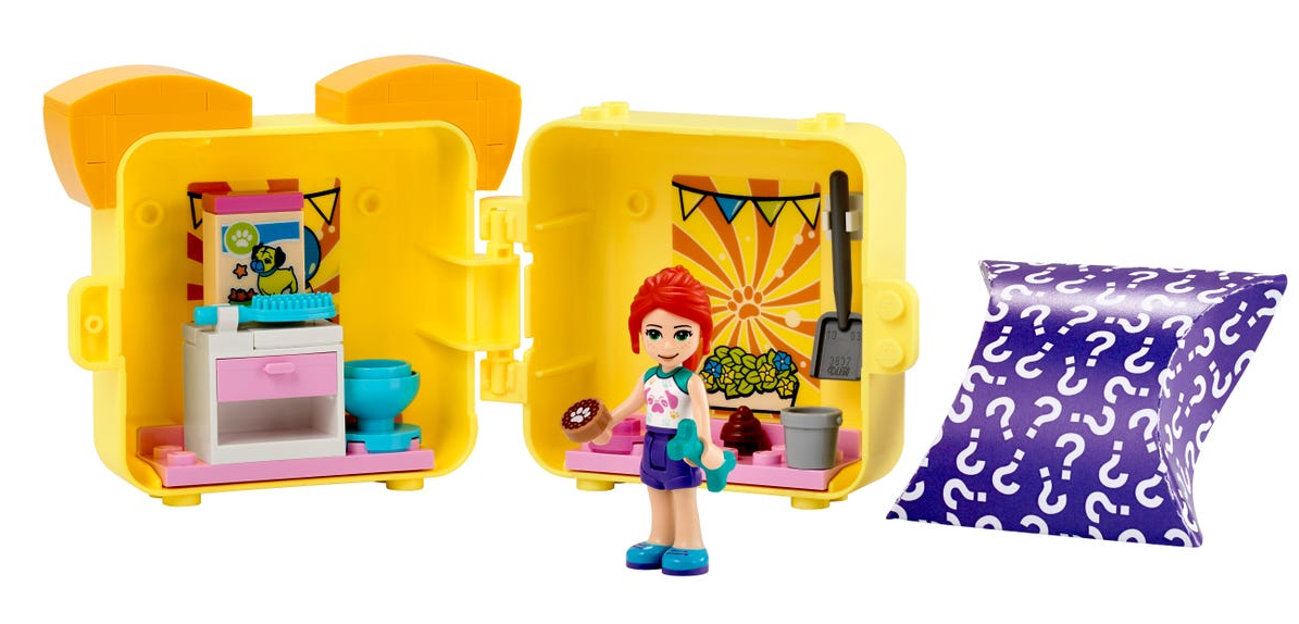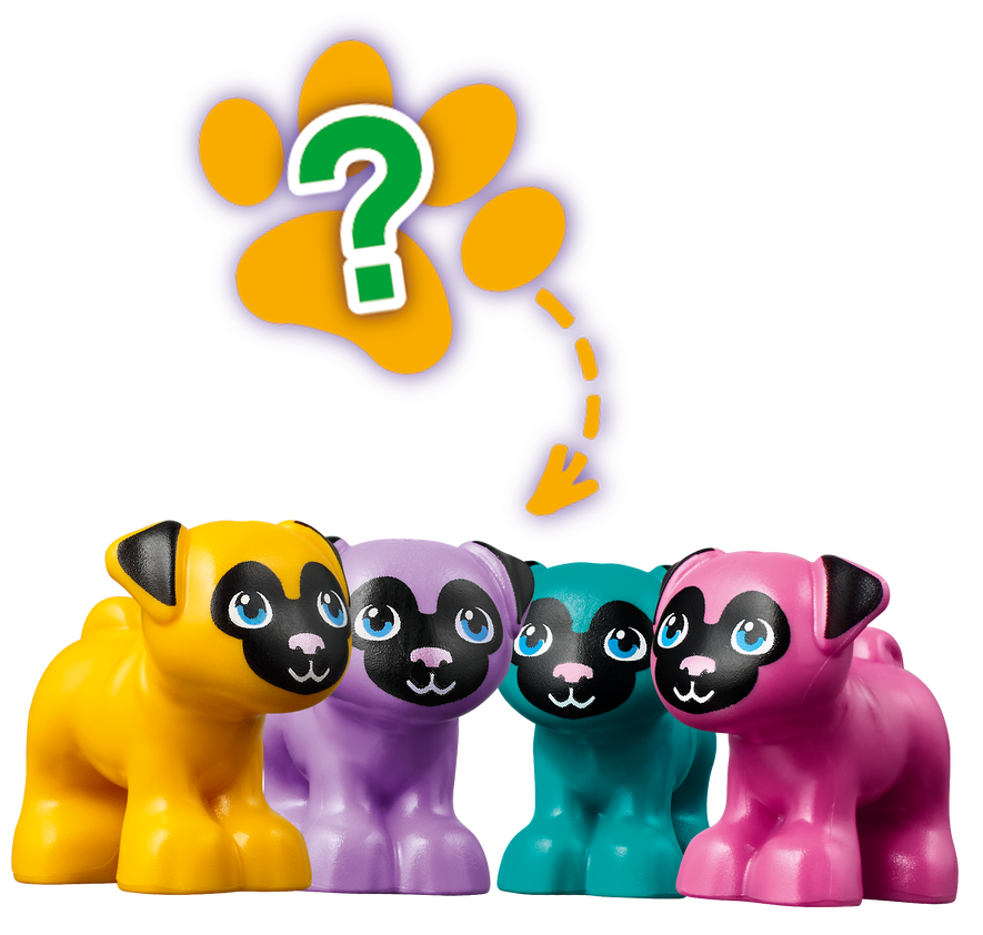 - W środku minilaleczka LEGO® Friends Mia, figurka mopsa (kolor jest niespodzianką) oraz szafka na kość do żucia i psie ciasteczko, którą trzeba zbudować.