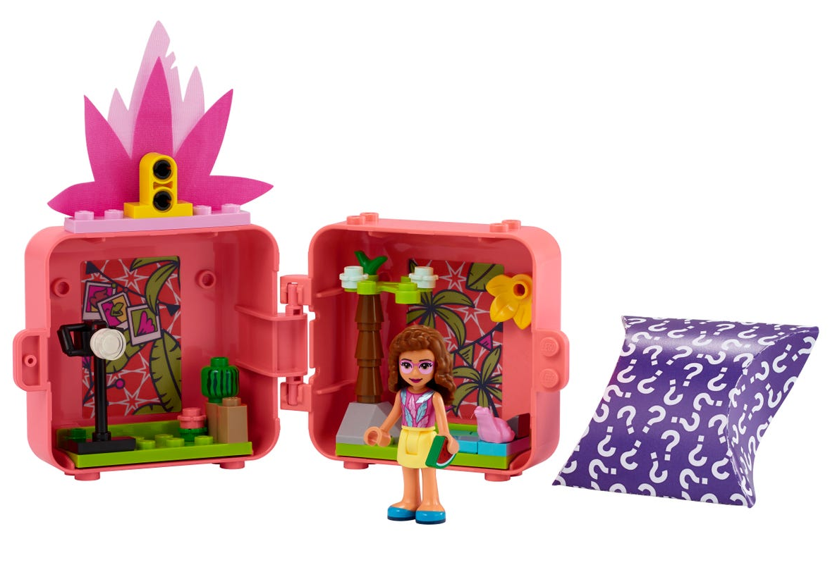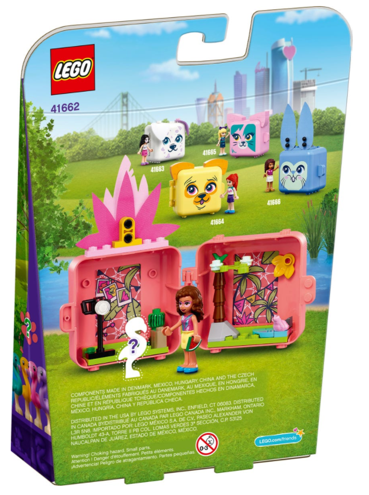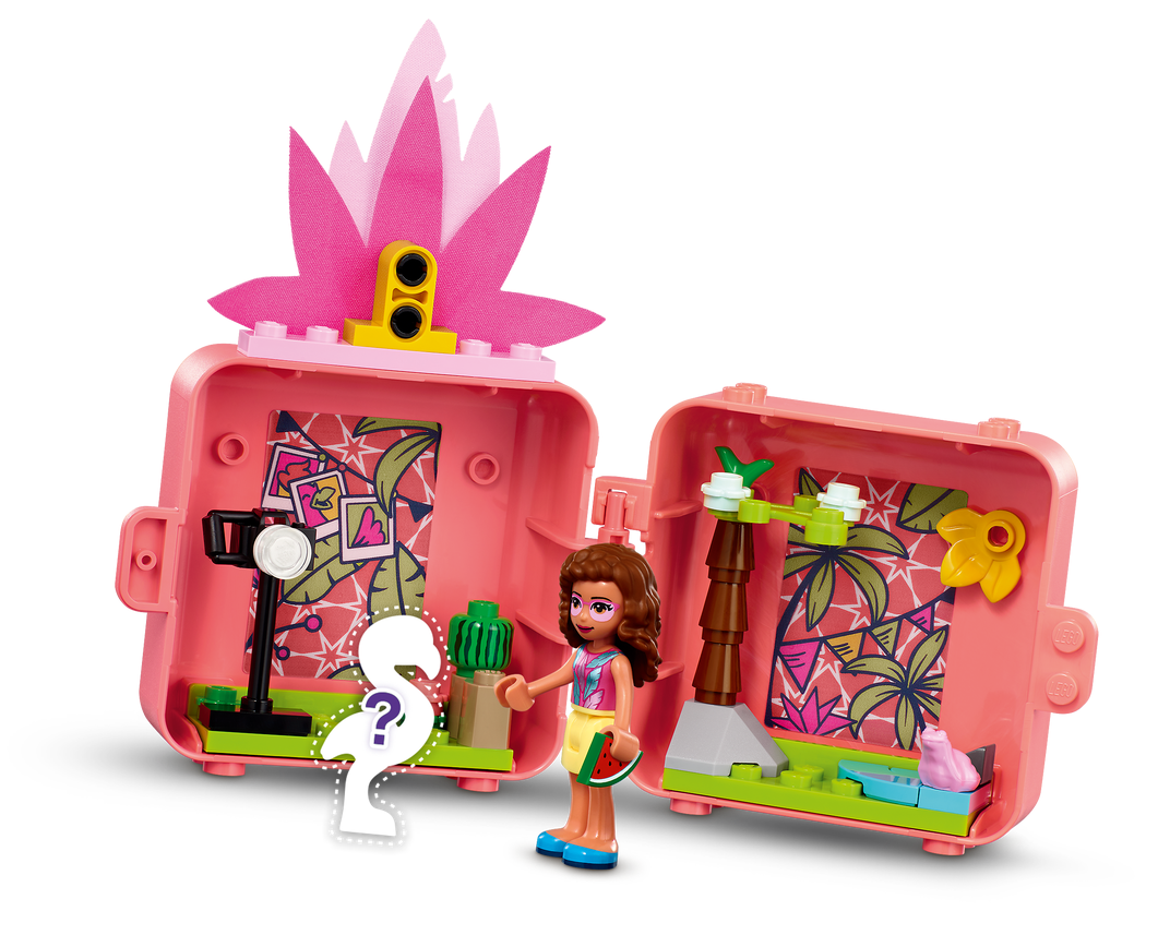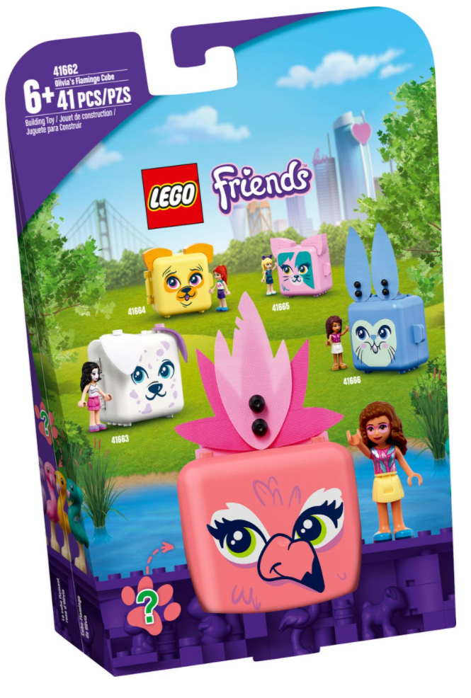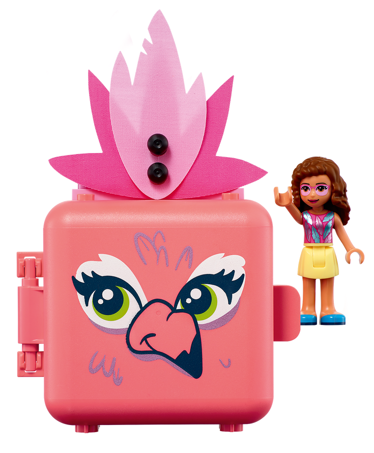 Zestaw LEGO® Friends Kostka Olivii z flamingiem (41662) może być fantastyczną niespodzianką. Pudełeczko jest ozdobione „twarzą” flaminga i ma na górze „pióra” z materiału. W środku dzieci znajdą popularną postać Olivii z LEGO Friends, figurki flaminga i żaby, a także wiele innych akcesoriów inspirujących do kreatywnej zabawy.