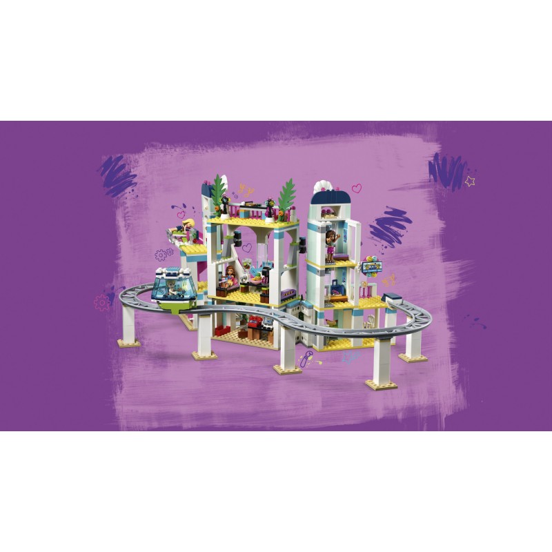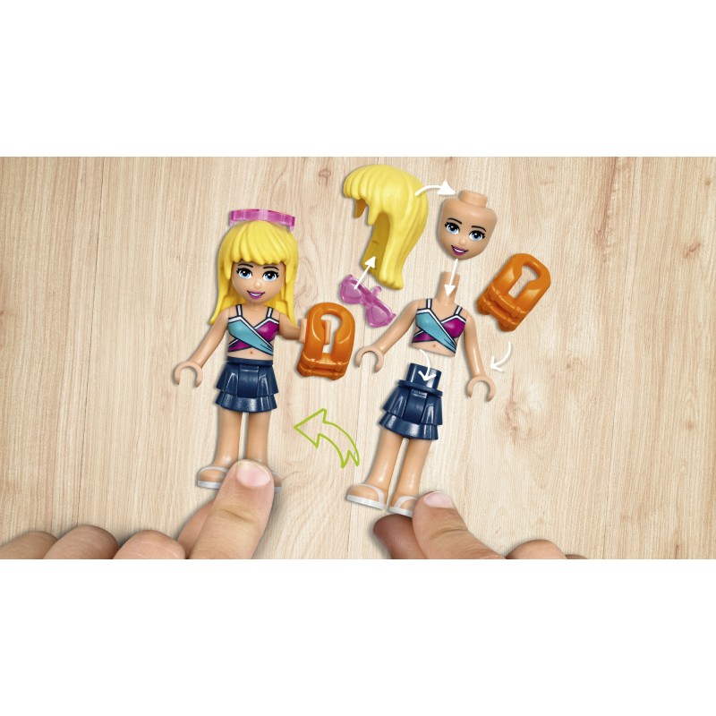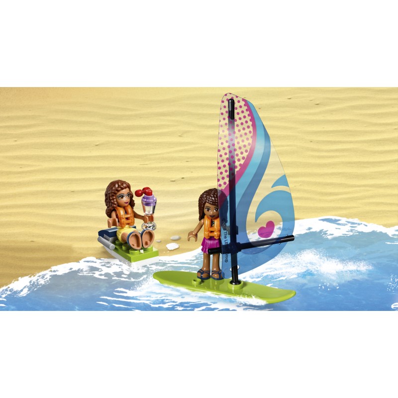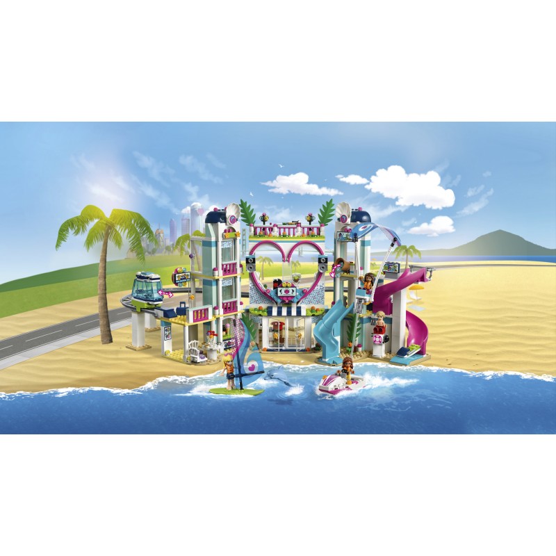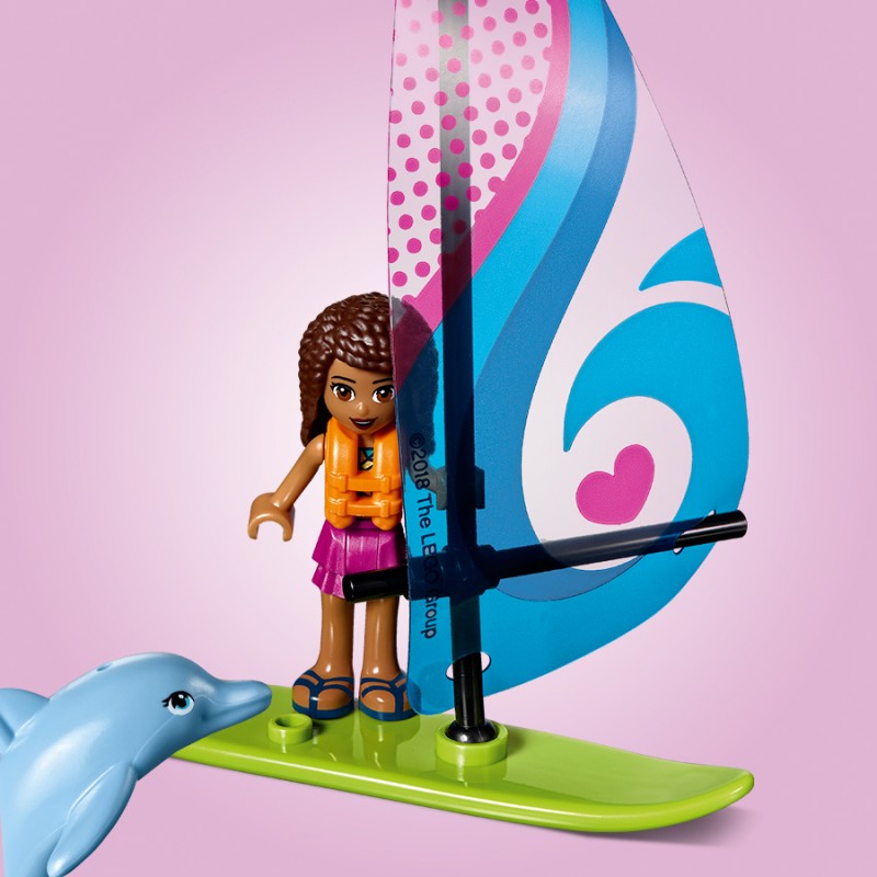 Zjedź po zjeżdżalniach do oceanu w parku wodnym i uważaj na wodospad wylewający się z przechylanego wiadra w zestawie LEGO® Friends 41347 Kurort w Heartlake! Spróbuj windsurfingu na malowniczej plaży lub wskocz na skuter wodny i pociągnij Andreę płynącą ze spadochronem holowanym. Patrzcie! Delfin! Pogawędź z ratownikiem Masonem, a potem pojedź kolejką jednoszynową z powrotem do hotelu, gdzie możesz odpocząć w barze z sokami albo urządzić plażową imprezę na tarasie na dachu w tym wakacyjnym zestawie z serii LEGO® Friends.