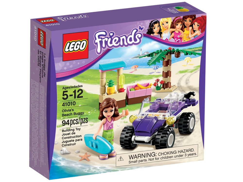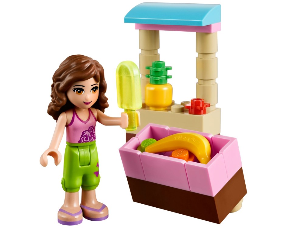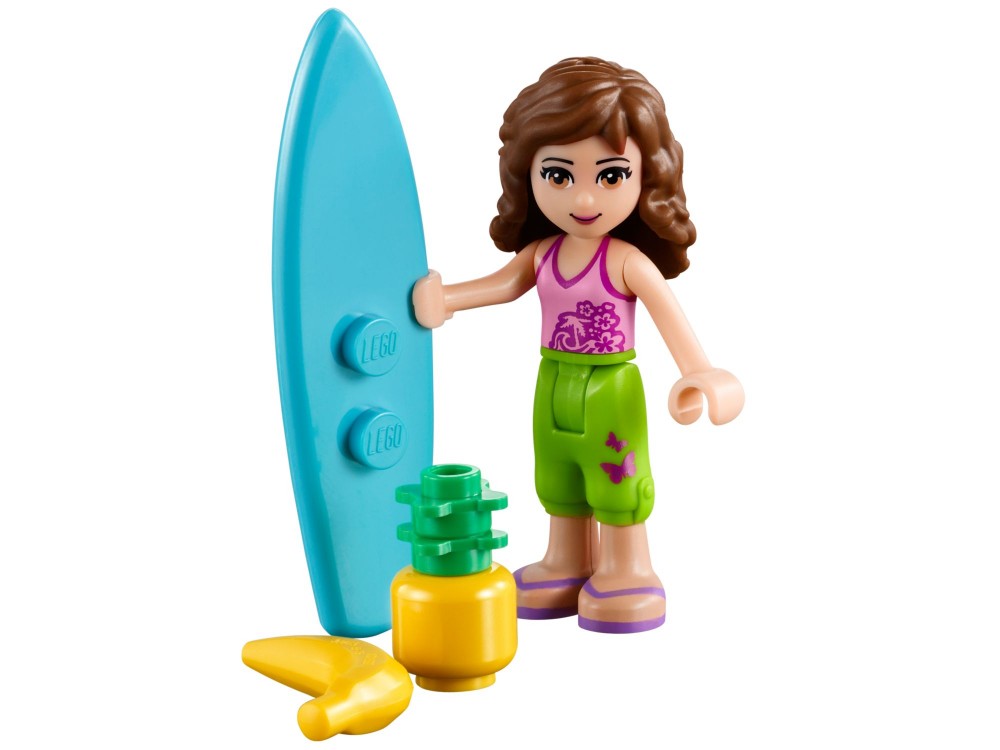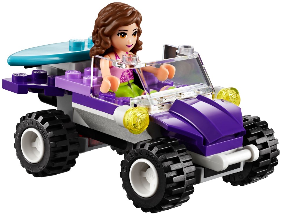 Rozerwij się latem w Heartlake City w łaziku plażowym Olivii! Zapakuj do niego deskę surfingową i ruszaj przez wydmy w stronę brzegu. Wyreguluj silnik kluczem i pokonaj nawet największe piaskowe wzgórza! Po wyczerpującej sesji na desce poczęstuj się pomarańczą lub lodami z plażowego stoiska i odpręż się w cieniu palmy kokosowej.