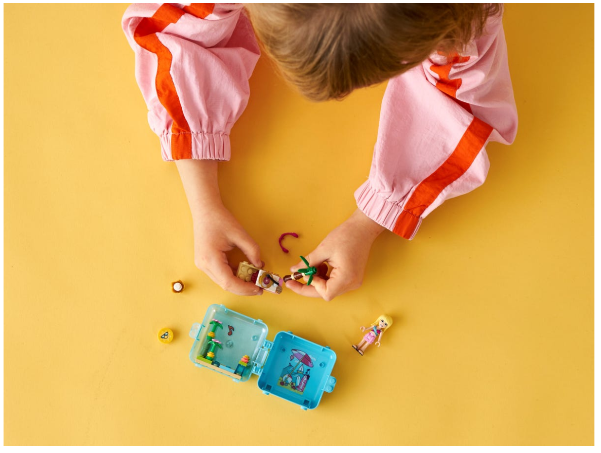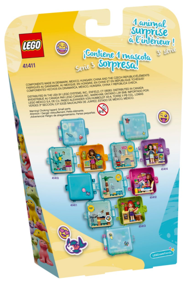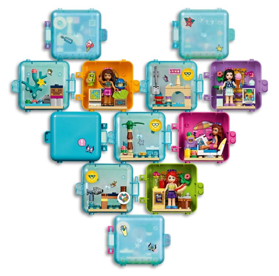 Każda przenośna letnia kostka do zabawy LEGO Friends zawiera tajemnicze zwierzątko w losowym kolorze. Dzieciom spodoba się zbieranie zwierzaków i zabawa coraz liczniejszą menażerią. Dzieci mogą wyjąć elementy plażowej scenerii z kostki LEGO Friends i bawić się nimi osobno. Mogą także przymocować je do dna kostki, dzięki czemu już nigdy żadne klocki nie zgubią się przy przenoszeniu z miejsca na miejsce. Poza tym obudowę kostki można rozłożyć na dwie części i bawić się razem z przyjaciółmi.
