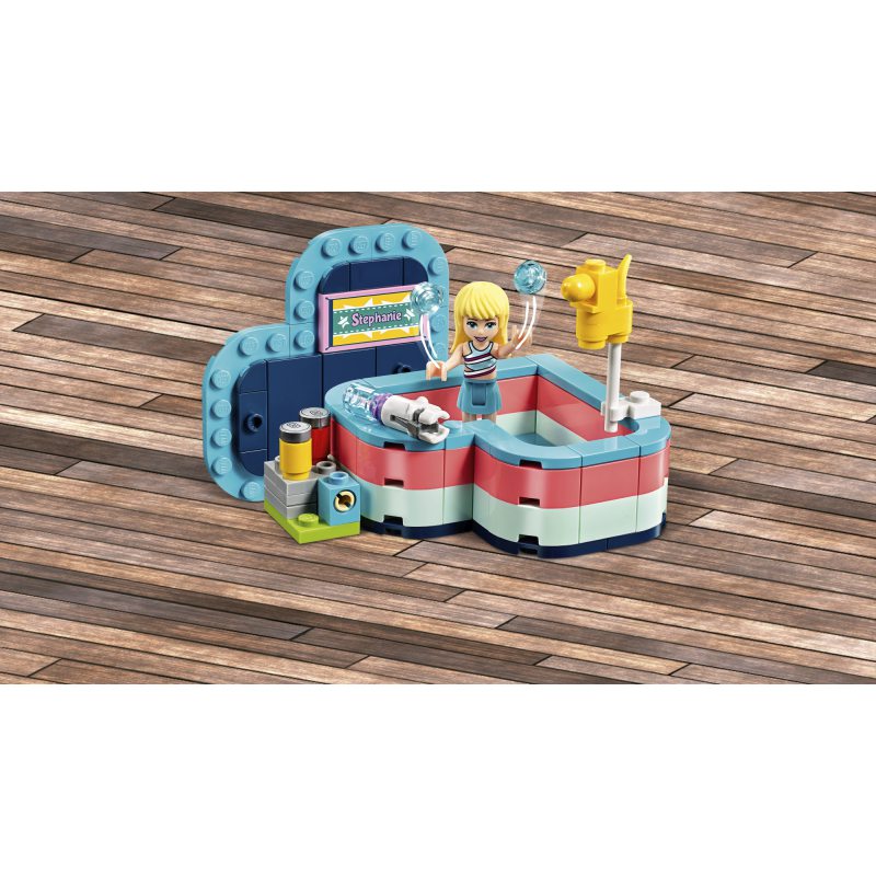 Zestrzel wszystkie puszki i zdobądź nagrodę w parku rozrywki z zestawu LEGO® Friends 41386 Pudełko przyjaźni Stephanie. Pudełko LEGO jest ozdobione płytką, która wygląda jak ręcznik plażowy i ma nadruk imienia Stephanie. Miłośnicy serii Friends mogą umieścić Stephanie na wieczku i pomóc jej wycelować na karnawałowej strzelnicy. W pudełku znajdują się niebieskie płytki przypominające morze, więc po zabawie Stephanie może urządzić sobie odświeżającą kąpiel. Na koniec można schować wszystkie elementy do pudełka z wieczkiem — dzięki temu lunaparkowe emocje będziesz mieć zawsze przy sobie. Zestaw z pudełkiem LEGO zawiera łatwe instrukcje i minilaleczkę Stephanie.