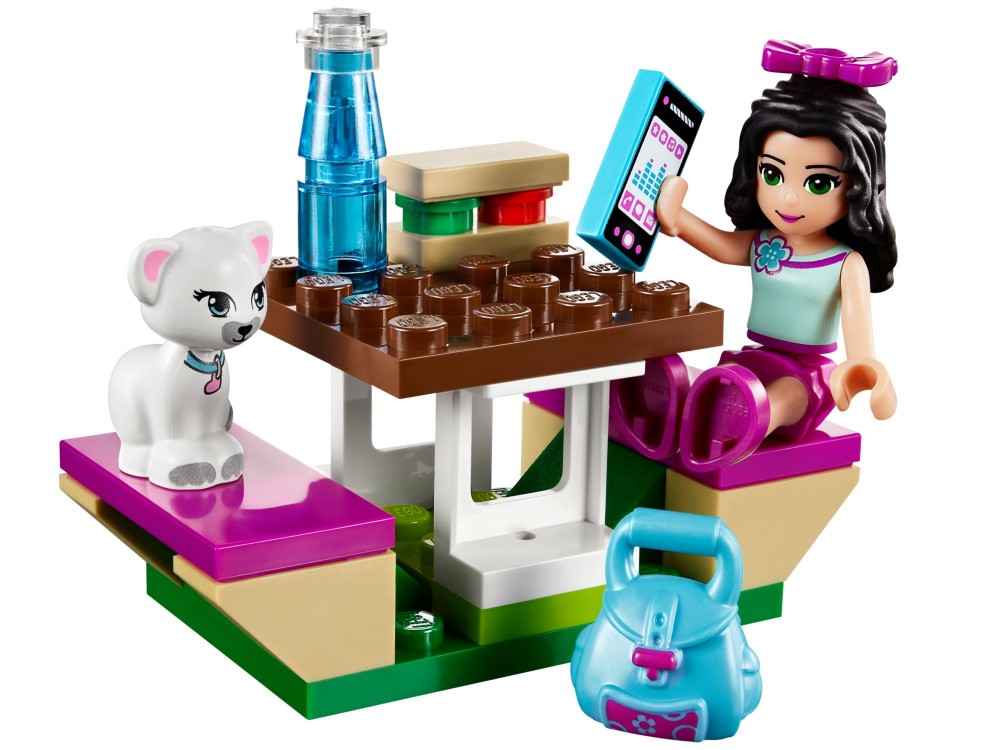 - akcesoria: kot Emmy, stół piknikowy z ławkami, kanapka, banan, mapa miasta, torba, znak drogowy, zwierzak i aparat fotograficzny.