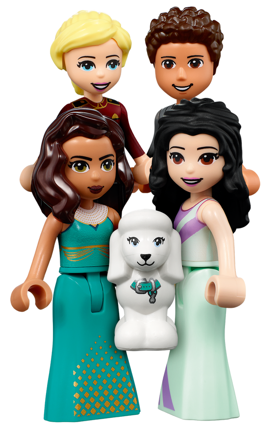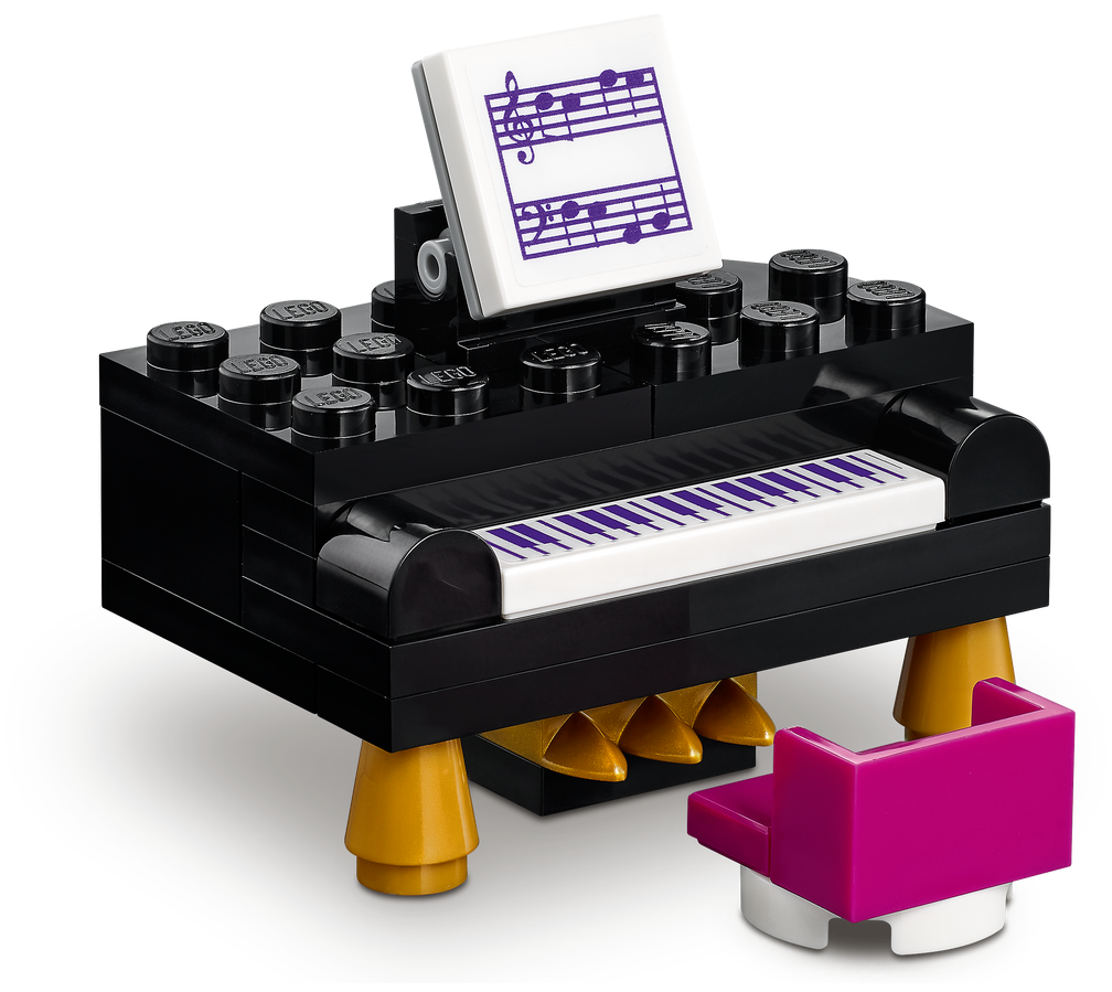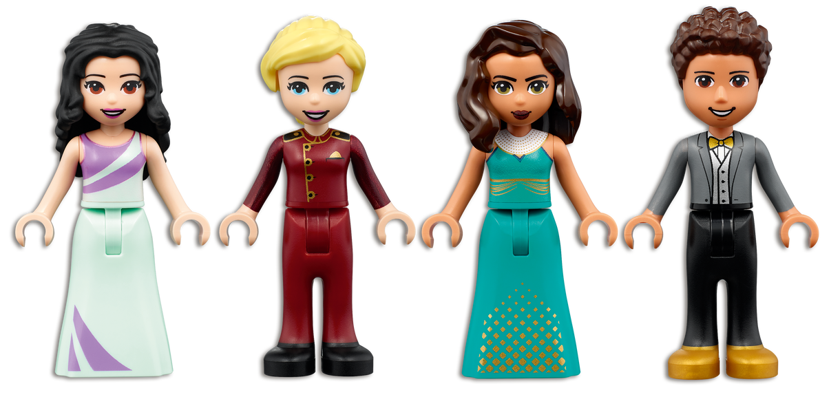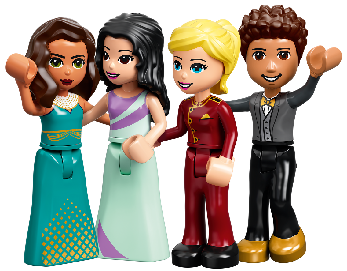 W hotelu jest mnóstwo do odkrycia — bar z pianinem, recepcja, pokoje z łazienką i jadalnia na zewnątrz. Nie zabrakło również odrobiny luksusu w postaci spa i penthouse’u. Zestaw zawiera minilaleczkę aktorki Amelii, więc dzieci mogą bawić się w scenki z życia gwiazd. W pudełku czekają też postacie LEGO® Friends — Stephanie, Emma i River, więc będzie kogo obsadzić w rolach gości, recepcjonisty i gońca hotelowego.
