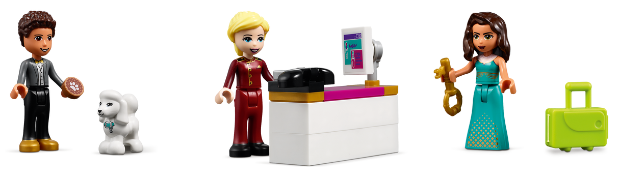 - Ten liczący 1308 elementów zestaw należy do serii LEGO® Friends, więc musiało się w nim znaleźć mnóstwo pobudzających wyobraźnię akcesoriów. Jest w nim nawet wózek gońca hotelowego i klucze, które pasują do drzwi!