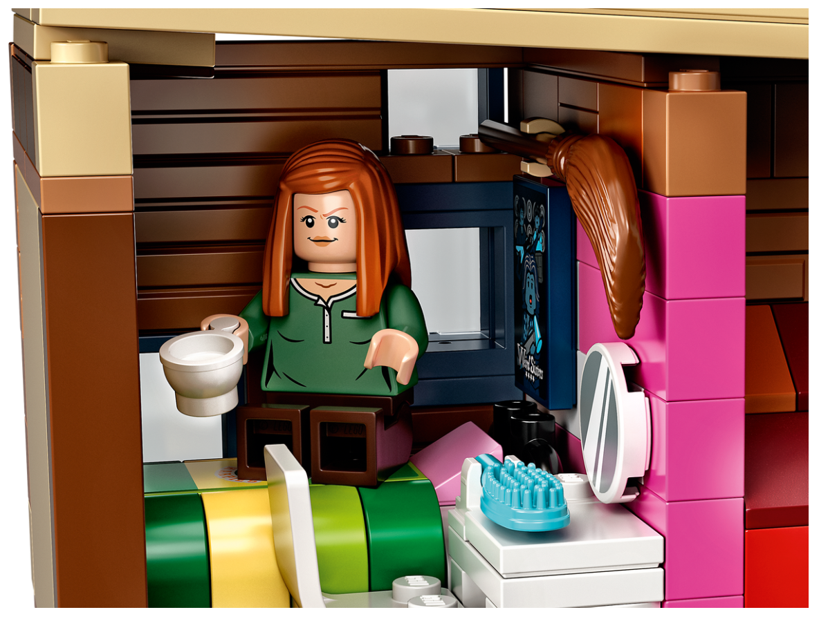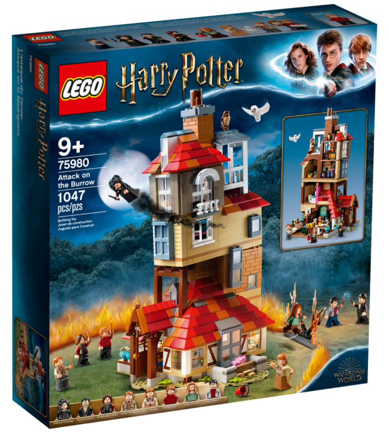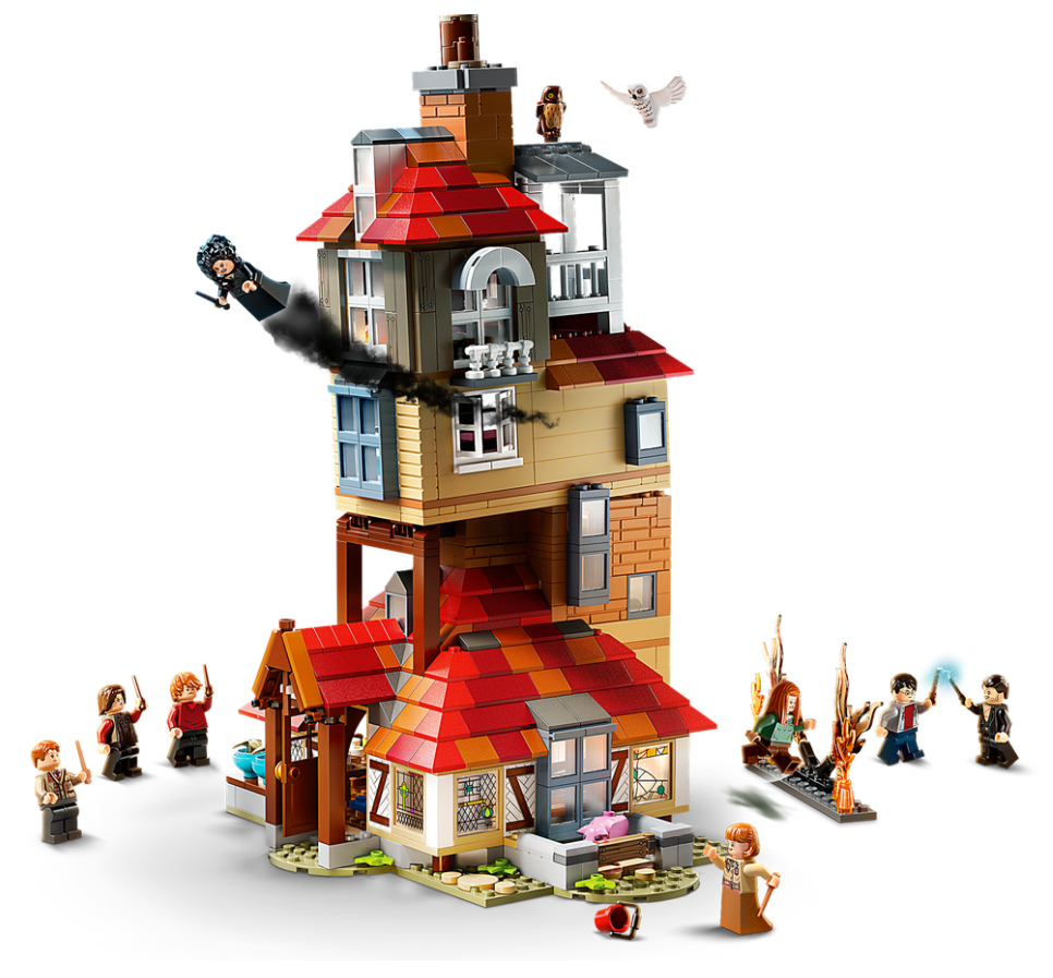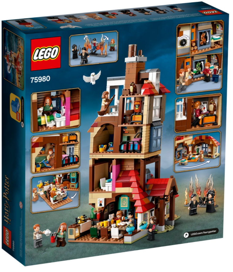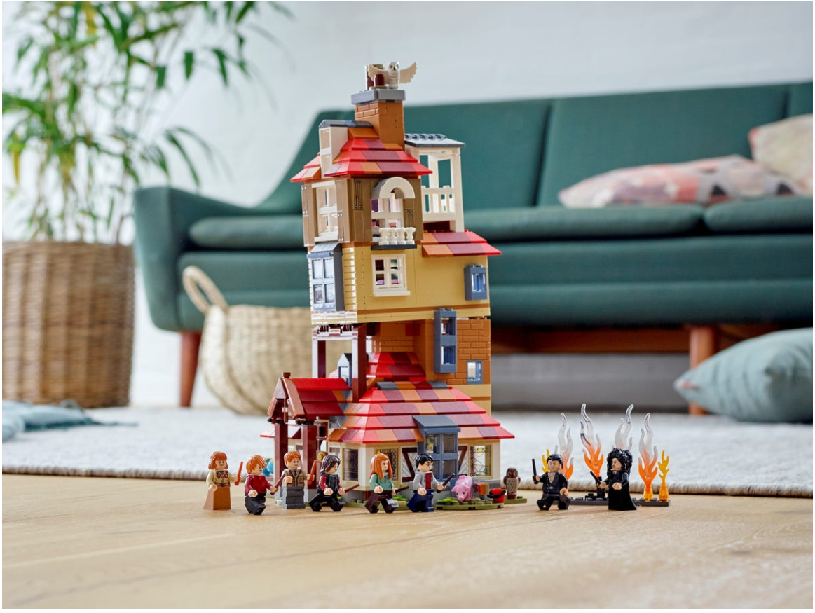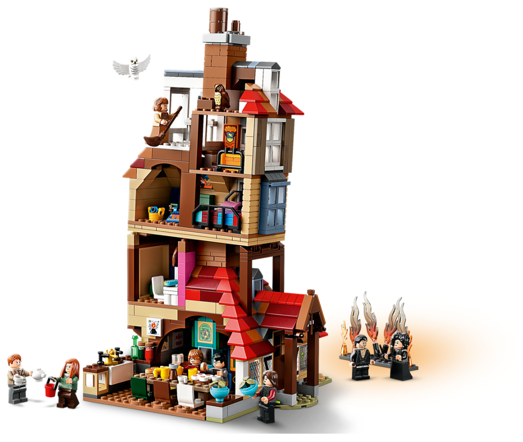Z tym modelem dzieci na pewno nie będą się nudzić — jest w nim mnóstwo detali, a do tego jedna strona domu Weasleyów otwiera się, ułatwiając zabawę. W pudełku jest osiem minifigurek, więc zabawa może się rozpocząć od razu. Przy odtwarzaniu sceny atakuzłych śmierciożerców — Bellatrix Lestrange i Fenrira Greybacka — na pewno przydadzą się elementy udające płomienie, które pozwalają ukazać niszczycielski pożar.