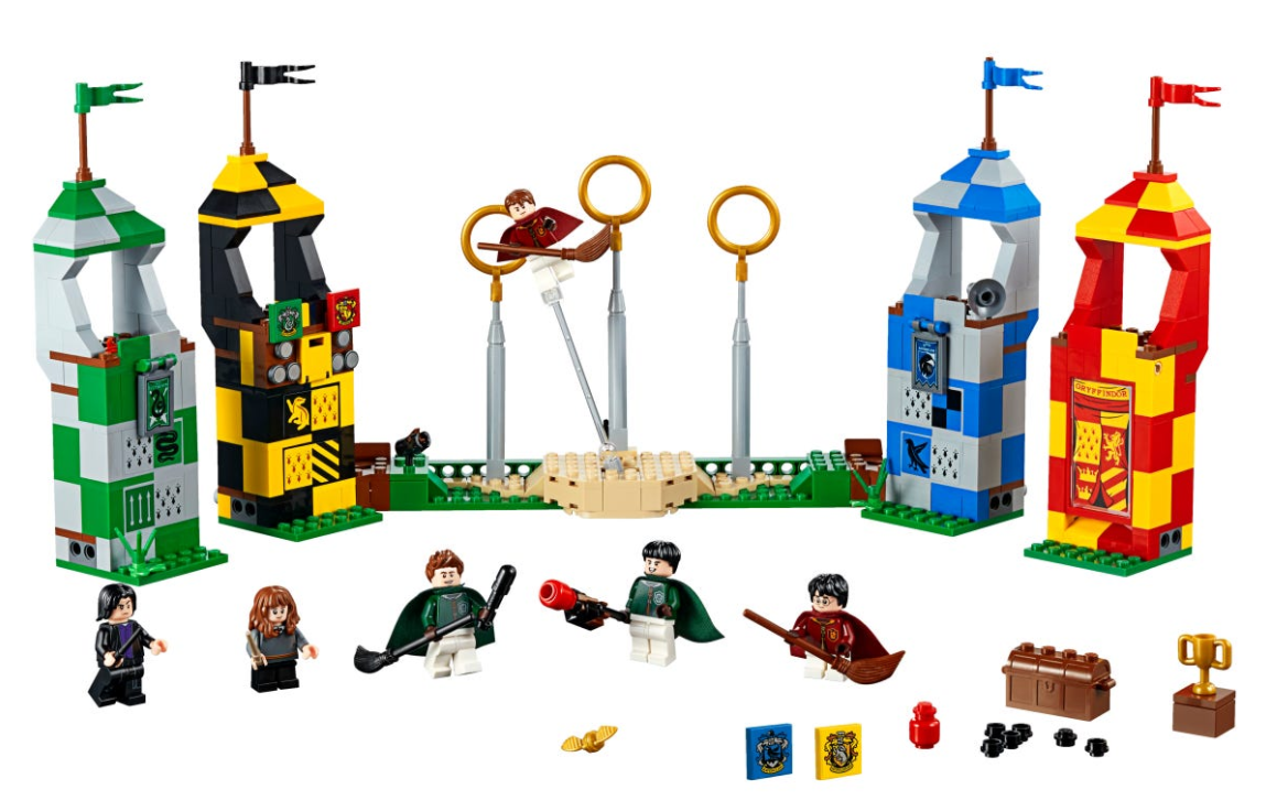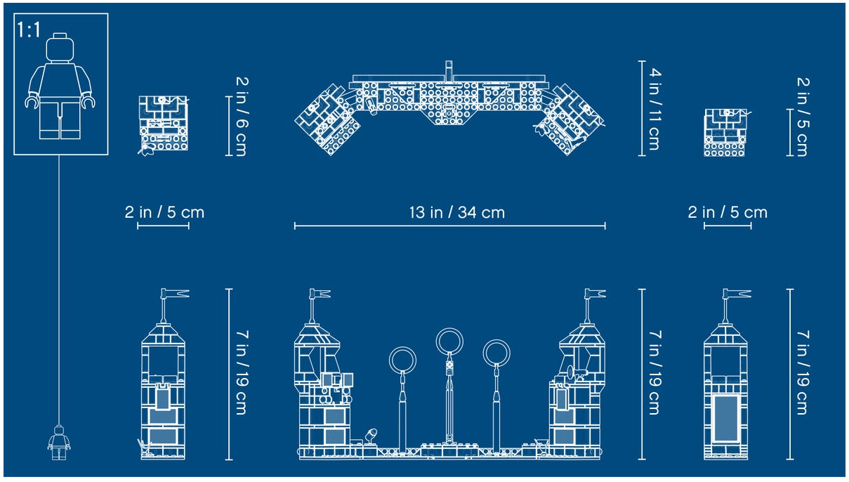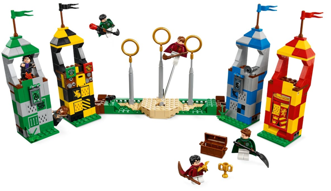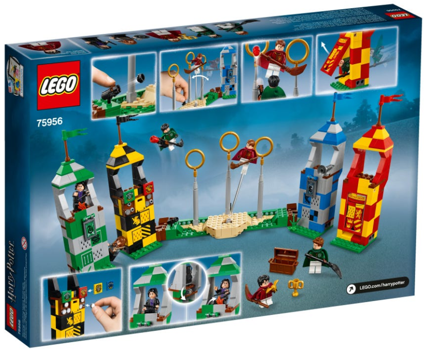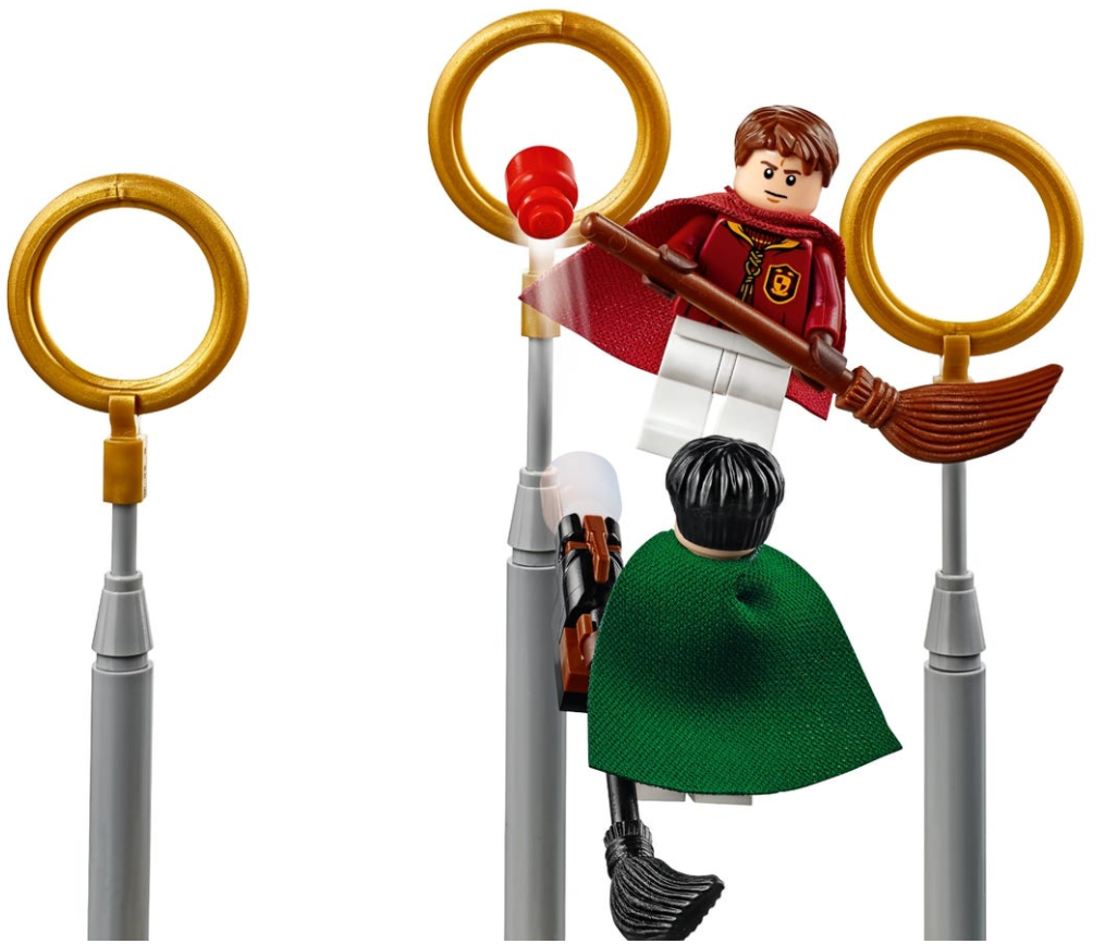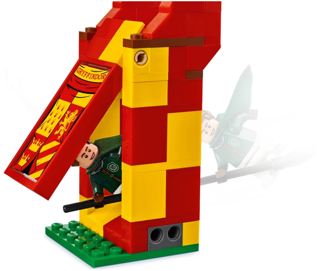 - Zestaw obejmuje wieżę Gryffindoru™ z otwieraną klapą, wieżę Slytherinu™ z wyskakującą funkcją zaklęcia ognia, wieżę Ravenclawu™ ze zdejmowanym megafonem i wieżę Hufflepuffu™ z tablicą wyników. Na podstawce znajdują się trzy obręcze na słupkach, funkcja poruszania obrońcą oraz miotacz klocków przedstawiających kafle.