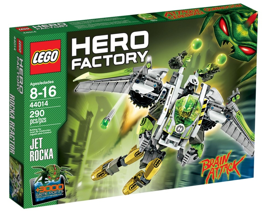 JET ROCKA, pospiesz się! Nikczemne mózgi przełamały obronę fabryki LEGO® Hero Factory! Zgłoś się do warsztatu po ściśle tajny odczepiany plecak odrzutowy. Jest wyposażony w otwierany, ochronny wyświetlacz, dwa miotacze plazmy, wystrzeliwane rakiety, ostre skrzydła plazmowe i potężne silniki jonowe. Dzięki tej technologii bez trudu wymanewrujesz te nikczemne mózgi!