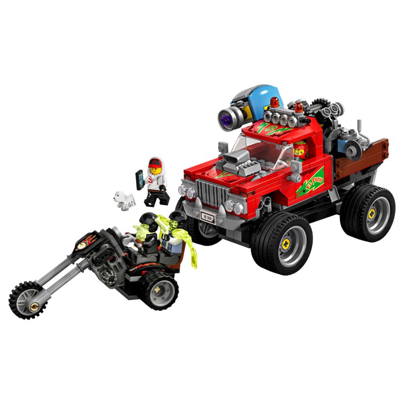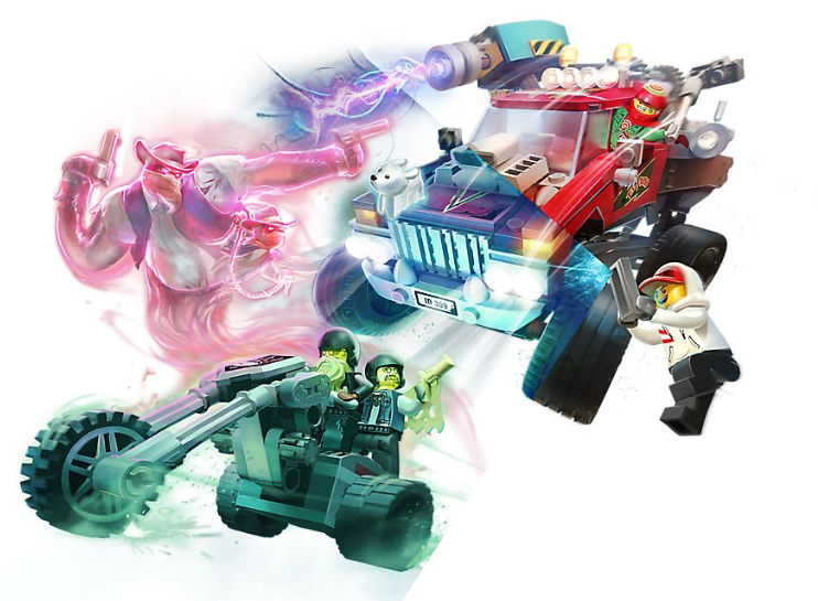 - Użyj aplikacji, by przenieść się do rozszerzonej rzeczywistości i ruszyć monster truckiem w pościg za duchami! W zestawie Samochód kaskaderski El Fuego znajdziesz cztery minifigurki: Jacka Davidsa, kaskadera El Fuego, motocyklistę Dwayne'a i motocyklistkę Joey, a także figurkę psiego ducha Spencera.