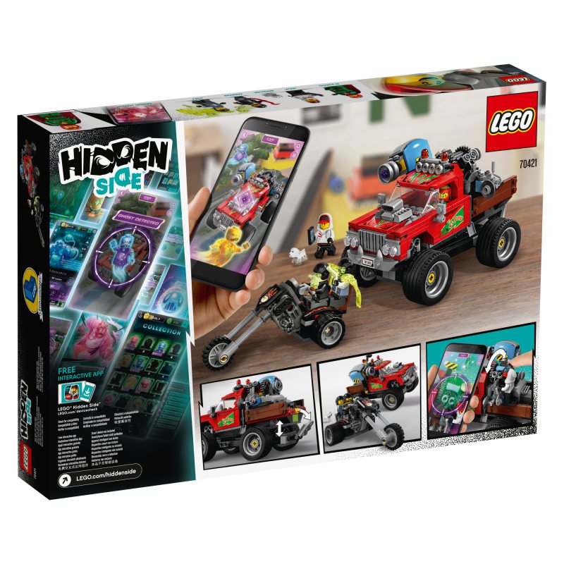 Zestaw 70421 Samochód kaskaderski El Fuego z serii LEGO® Hidden Side™ przenosi zabawę w niezwykły świat rozszerzonej rzeczywistości, co gwarantuje jeszcze większą dawkę emocji. Pobierz aplikację Hidden Side i zeskanuj ten niesamowity model za pomocą telefonu, aby go ożywić. Zobacz, jak interakcja z modelem w prawdziwym świecie może wpływać na to, co dzieje się w aplikacji. Poznaj nowy rodzaj zabawy i interakcji z klockami w zestawie LEGO Hidden Side: będziesz zbierać ciekawe przedmioty i duchy oraz grać w gry, a dzięki regularnym aktualizacjom nigdy nie zabraknie Ci nowych zagadek do rozwiązania i potężnych przeciwników! Samochód El Fuego ma działające tylne zawieszenie, więc dzieci mogą próbować akrobacji i skoków. Mogą także wraz z Jackiem Davidsem i jego psim duchem Spencerem zająć miejsce na pace furgonetki i za pomocą zabawkowej armaty wypędzić duchy z dwojga nawiedzonych motocyklistów, którzy jadą 3-kołowym chopperem. Możliwości kreatywnej zabawy są po prostu nieograniczone.