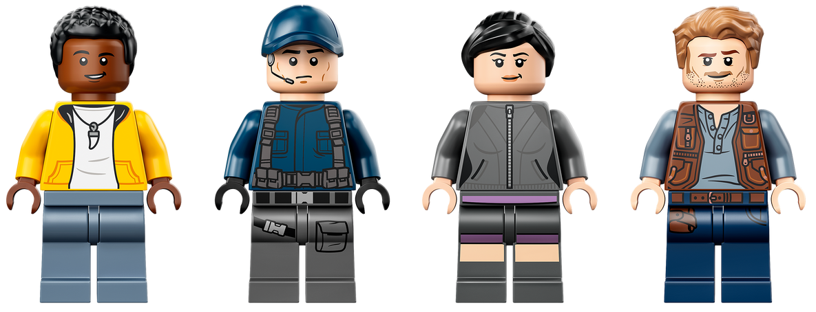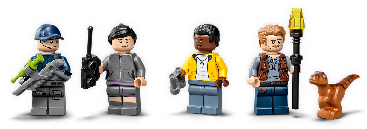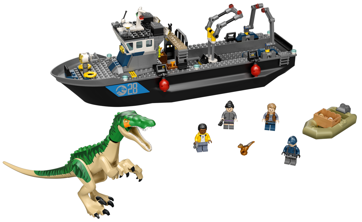 - W zestawie są cztery minifigurki: Darius, Yaz, Owen Grady i strażnik. Jest tam również ruchoma figurka barionyksa, mały dinozaur, dwie zabawkowe ryby oraz akcesoria, w tym środek uspokajający, paralizator i dwa jaja dinozaura.