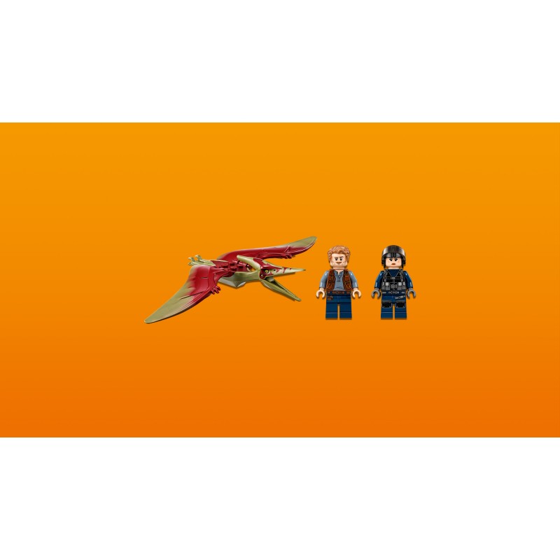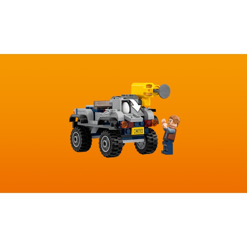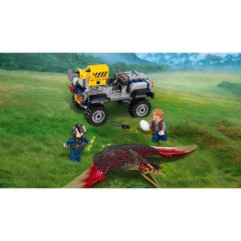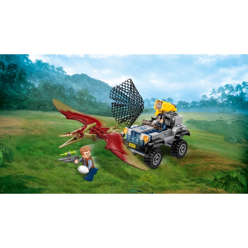 Rozegraj scenę szaleńczego pościgu zainspirowaną filmem Jurassic World™ i pomóż Owenowi oraz tropicielce uratować pteranodona. Ten emocjonujący zestaw LEGO® z dinozaurami zawiera szybką terenówkę z miotaczem siatki, pistolet ze środkiem usypiającym, dwie minifigurki oraz figurkę pteranodona.