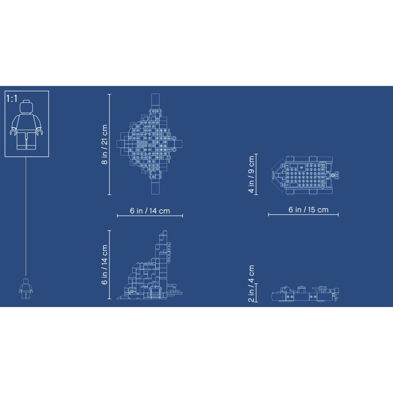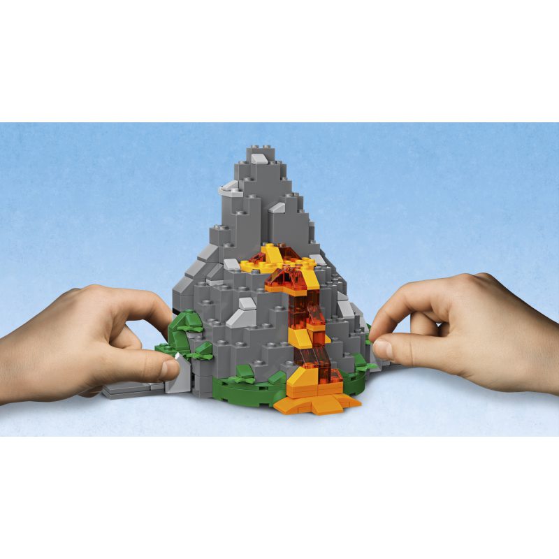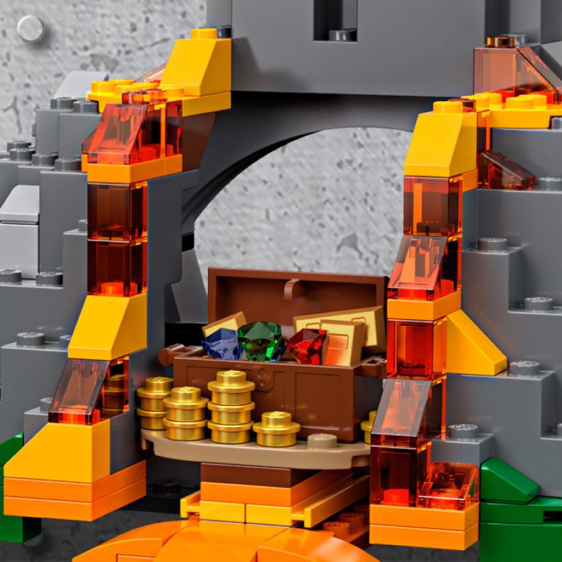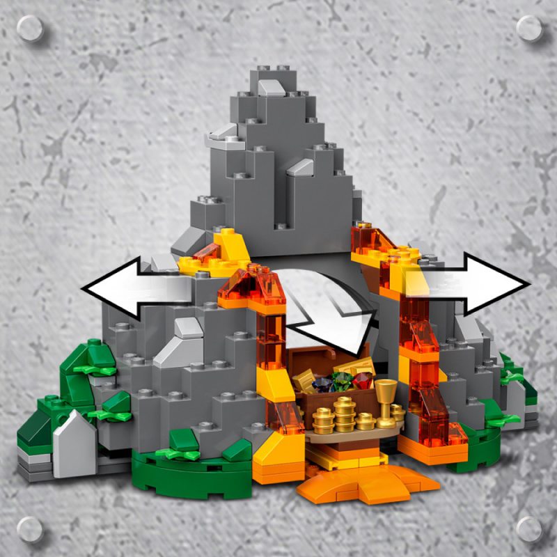 - Zbudowana z klocków LEGO® skała wulkaniczna ozdobiona jest lawą i ma funkcję otwierania, która pozwala dostać się do skrzyni skarbów wypełnionej 11 złotymi monetami, czterema sztabkami złota, złotym pucharem i czterema klejnotami.