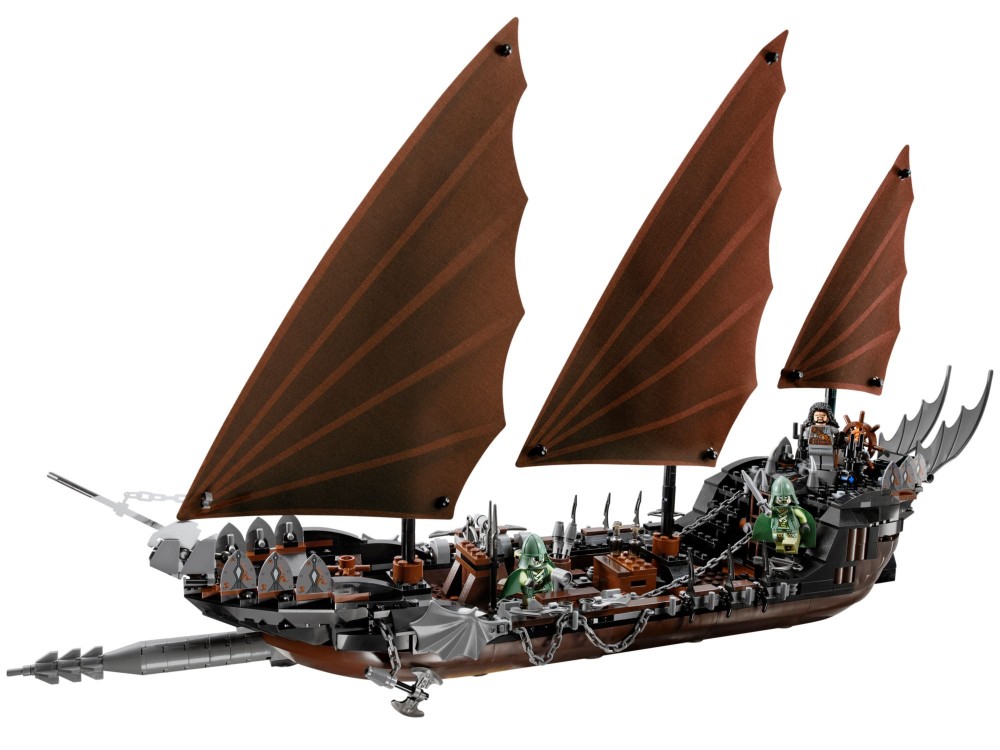 Nad brzegiem przy Minas Tirith orki Saurona z Mordoru przygotowują się do powitania sojuszników przybywających pirackim statkiem — ale pozory mylą. Zatrzymaj się przy nich, zrzuć kotwicę i poprowadź atak z zaskoczenia jako Aragorn, Gimli, Legolas i Armia Umarłych. Ten majestatyczny korsarski statek ma 3 duże żagle, zdejmowaną tylną część z lochem i więźniem — korsarzem z Umbaru, działającą kuszę i mnóstwo broni oraz zbroi! Przejmij katapultę Orków i poprowadź świecącego w ciemności Króla Umarłych oraz jego żołnierzy do boju w Wojnie o Pierścień!