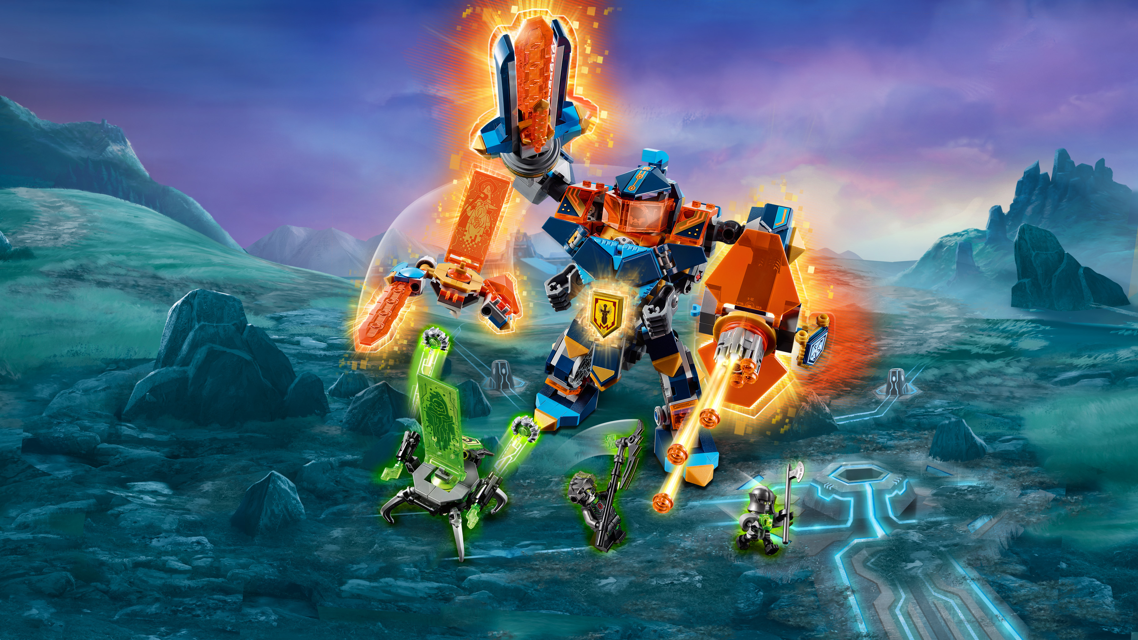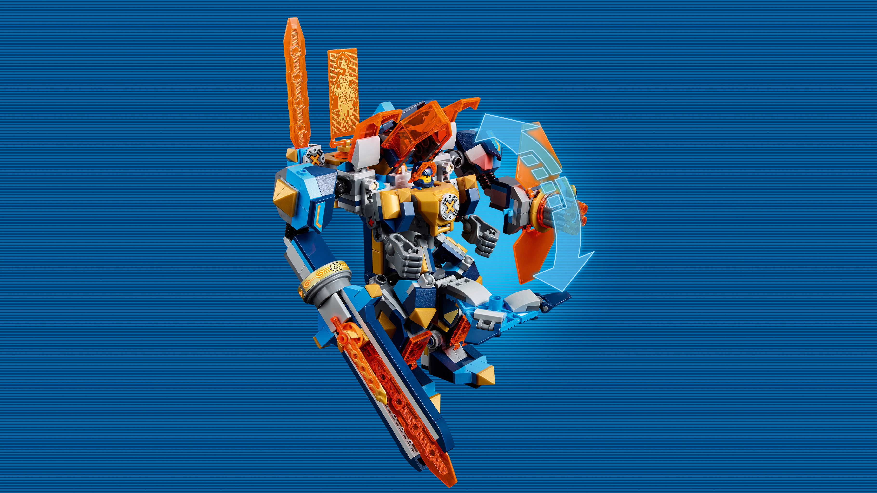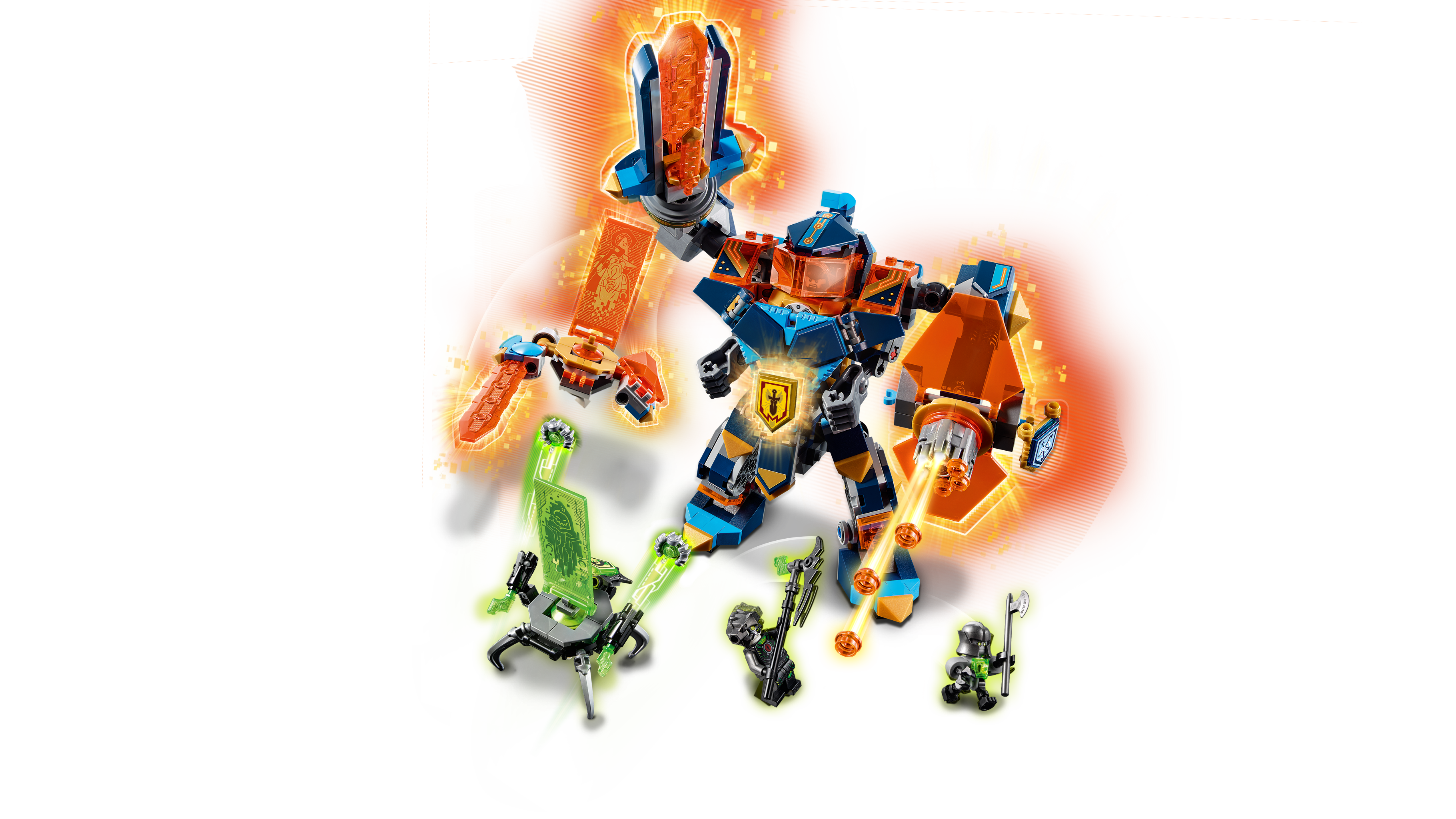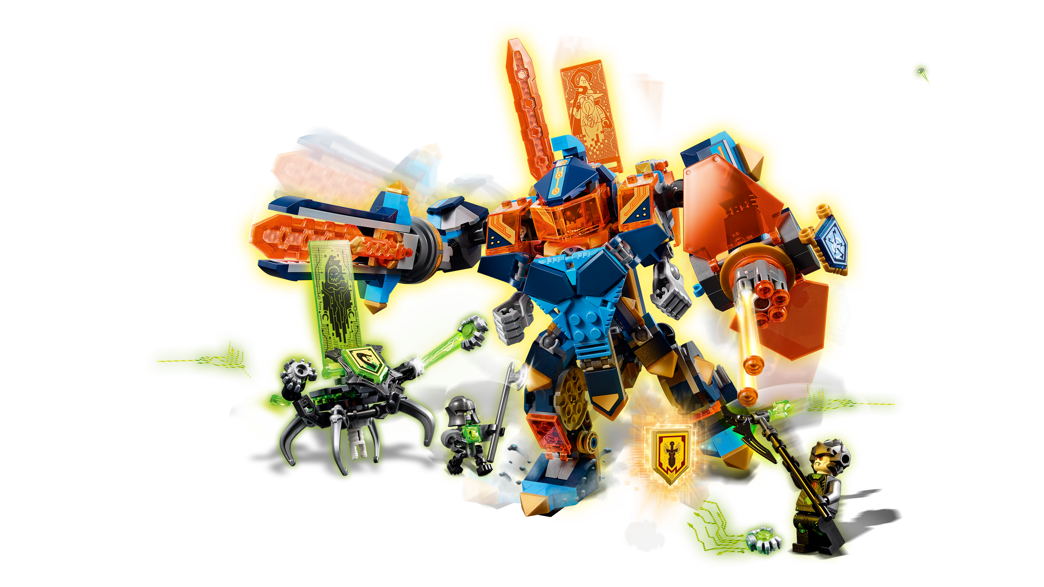 Złap Monstroxa, zanim zniszczy mecha Claya swoją nikczemną infekcją technologiczną! Umieść Claya w jego niezawodnej zbroi i wsiądź do potężnego mecha z ogromnym mieczem, osłoniętym szybkostrzelnym działkiem na sześć klocków oraz dodatkową pomocą Merloka 2.0 z tyłu. Rzuć się w pogoń za Monstroxem na potwornych nogach i powstrzymaj Infektobajtera oraz jego pomocnika Cyberbajtera, zanim rozsieją cyfrową infekcję po całym królestwie. W zestawie są trzy tarcze mocy NEXO do zeskanowania: Wir, Dżunglowy Smok i moc Merloka — Miecz Merloka.