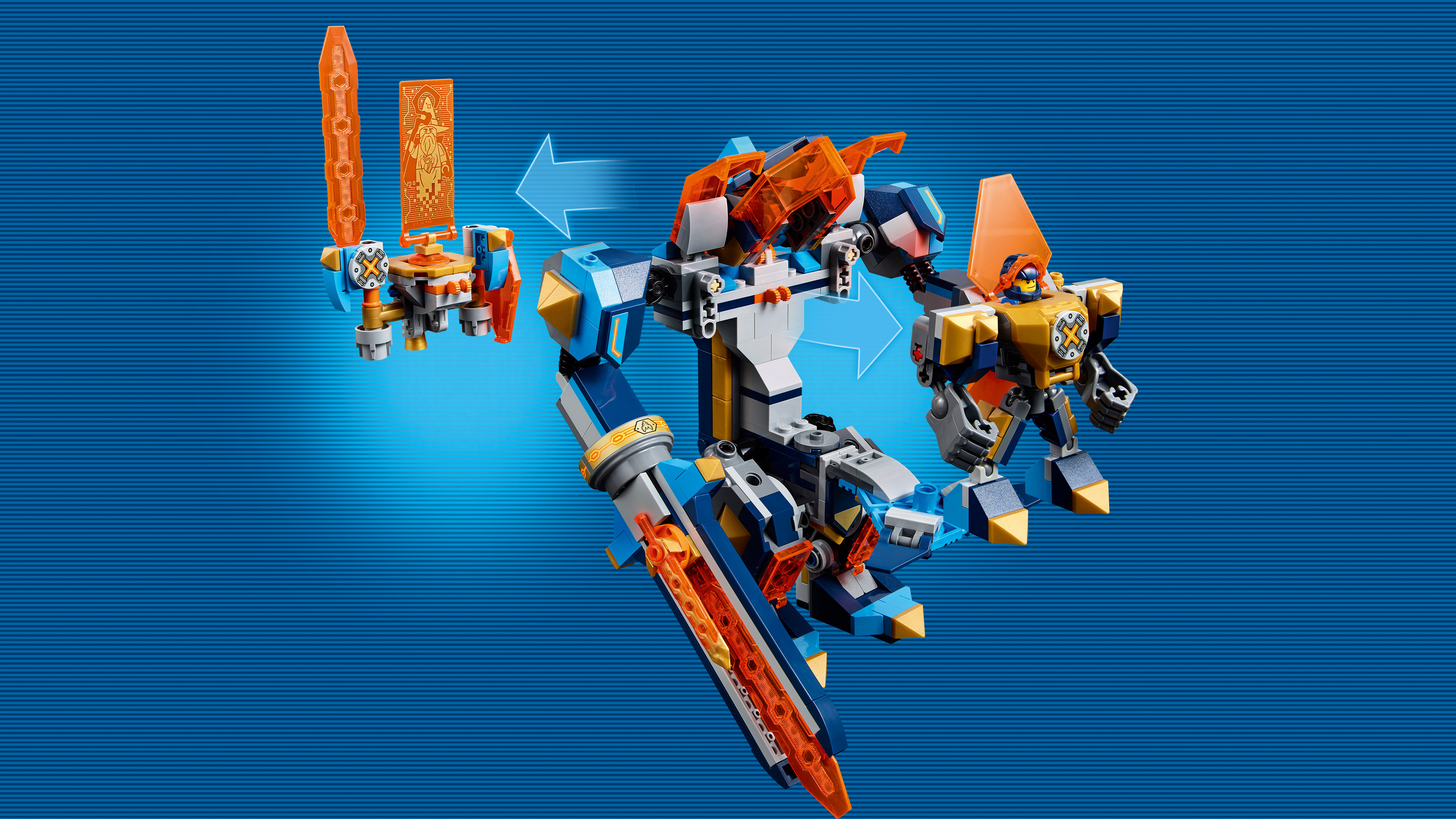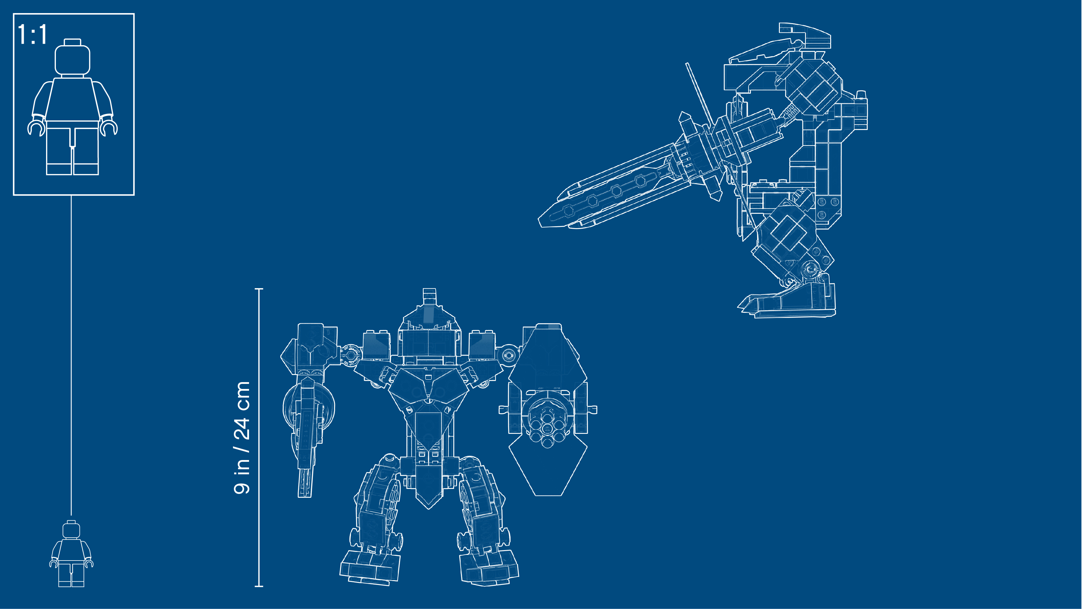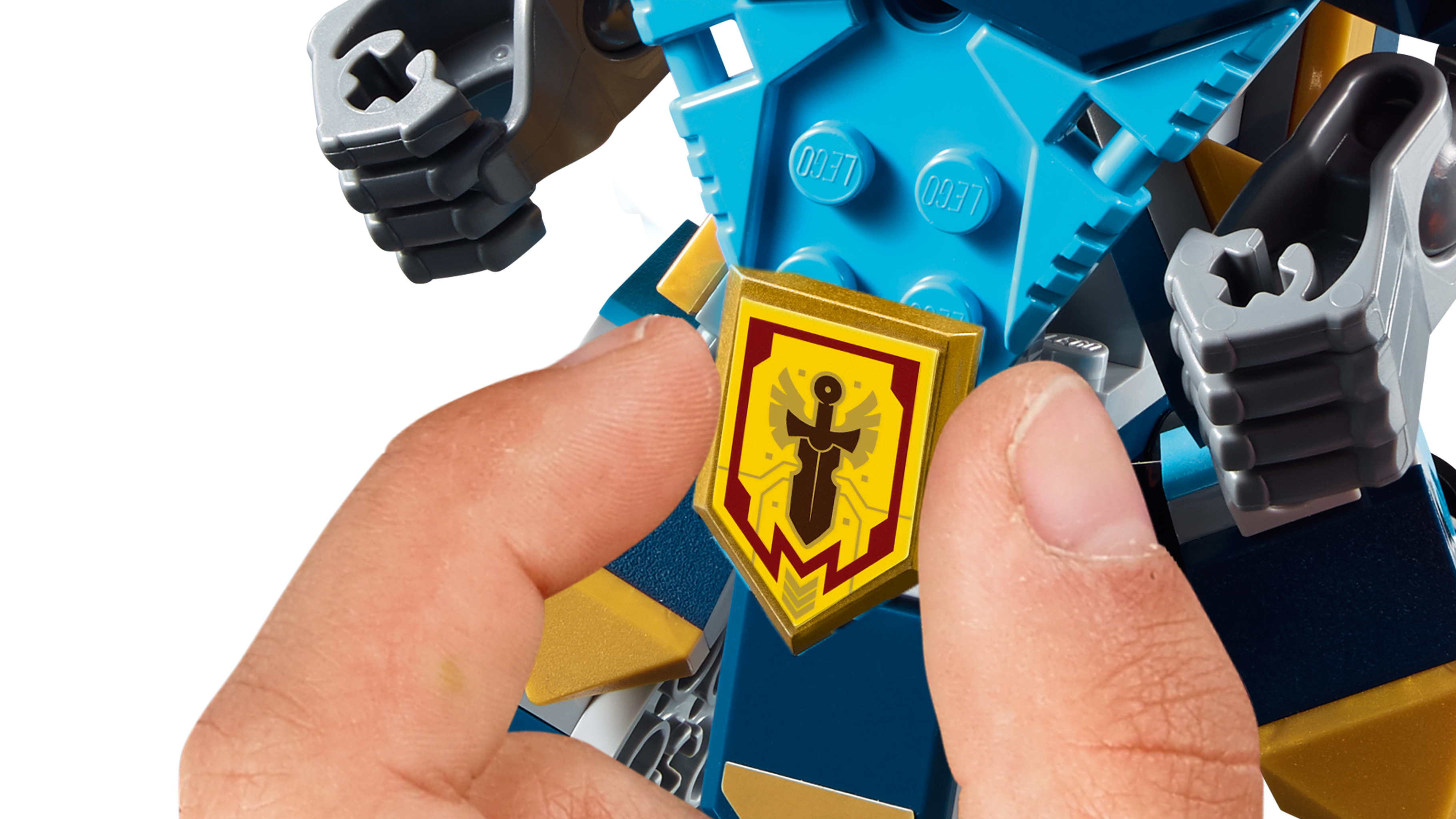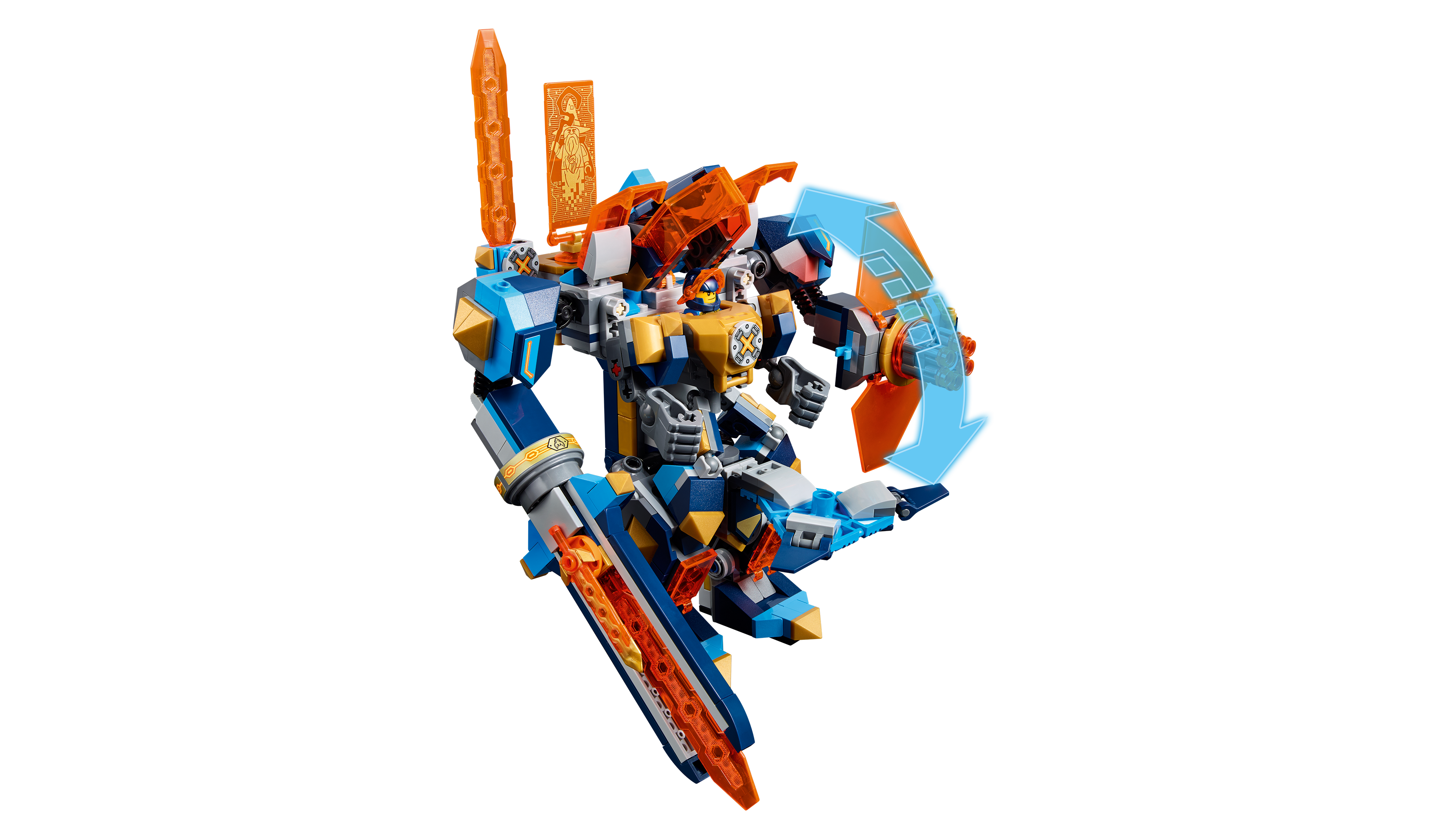 - Mech Claya ma kokpit na minifigurkę, miecz, tarczę z szybkostrzelnym działkiem na sześć klocków, tarczę mocy Combo NEXO oraz odczepianą figurkę hologramu Merloka 2.0 przymocowaną do lotni z mieczem i uchwytem na tarczę.