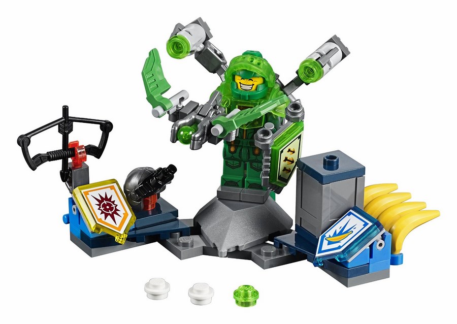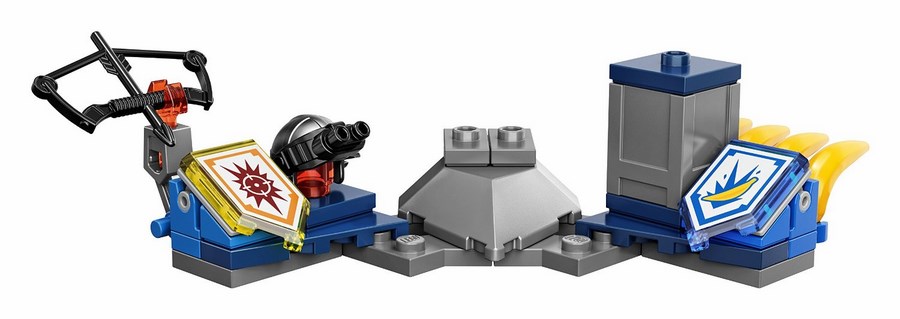 Tarczowy blaster to potężna moc NEXO! Dzięki niej wrogowie Niepokonanego Aarona uciekają w popłochu. Zwycięstwo jest zawsze słodkie, a ty możesz je dodatkowo doprawić bananami —a dokładnie bananowymi bombami! Podnieś swoją wartość bojową, skanując tarcze 3 mocy NEXO.